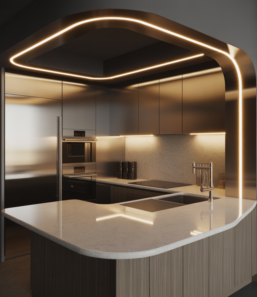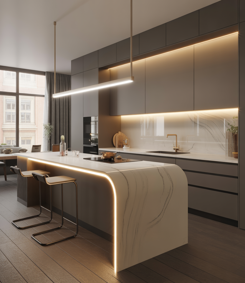 A modern luxury counter extension uses a uniquely shaped overhang or curve to stretch function in a compact kitchen without feeling cramped. This works beautifully in tight condos where a small dining ledge can replace a full table. I once visited a San Diego remodel where a curved quartz extension doubled as both a prep zone and a work-from-home perch—an approach many high-end designers now champion for 2026’s flexible living styles.