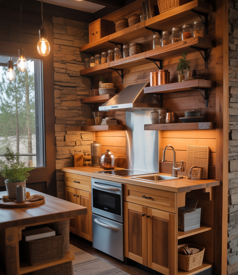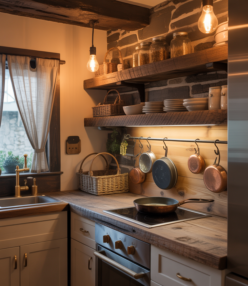 A rustic small kitchen combines distressed woods, matte metals, and handcrafted touches even in tiny footprints. This idea often shines in vacation cabins, city lofts, and rental apartments where texture compensates for limited room. I once helped a friend outfit her tiny upstate cabin with reclaimed shelves—suddenly the room felt intentional rather than improvised. Sites like Remodelista consistently praise rustic simplicity for small spaces.