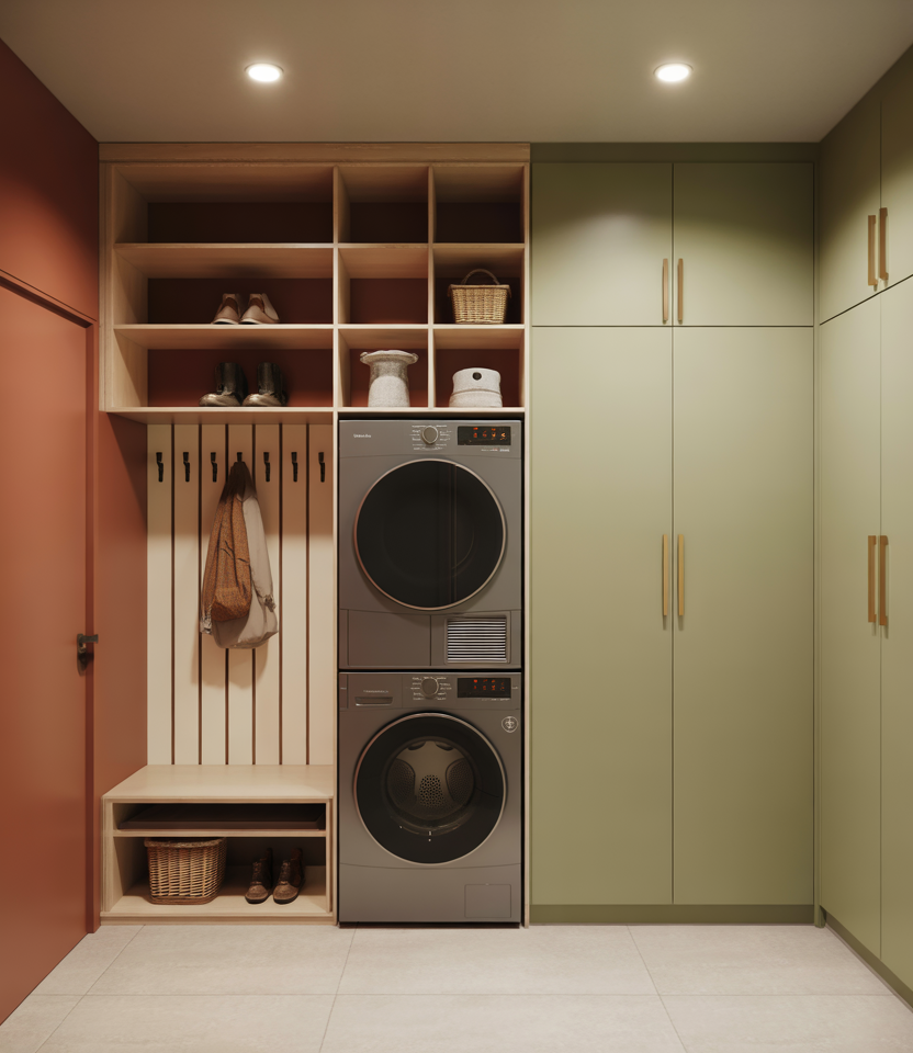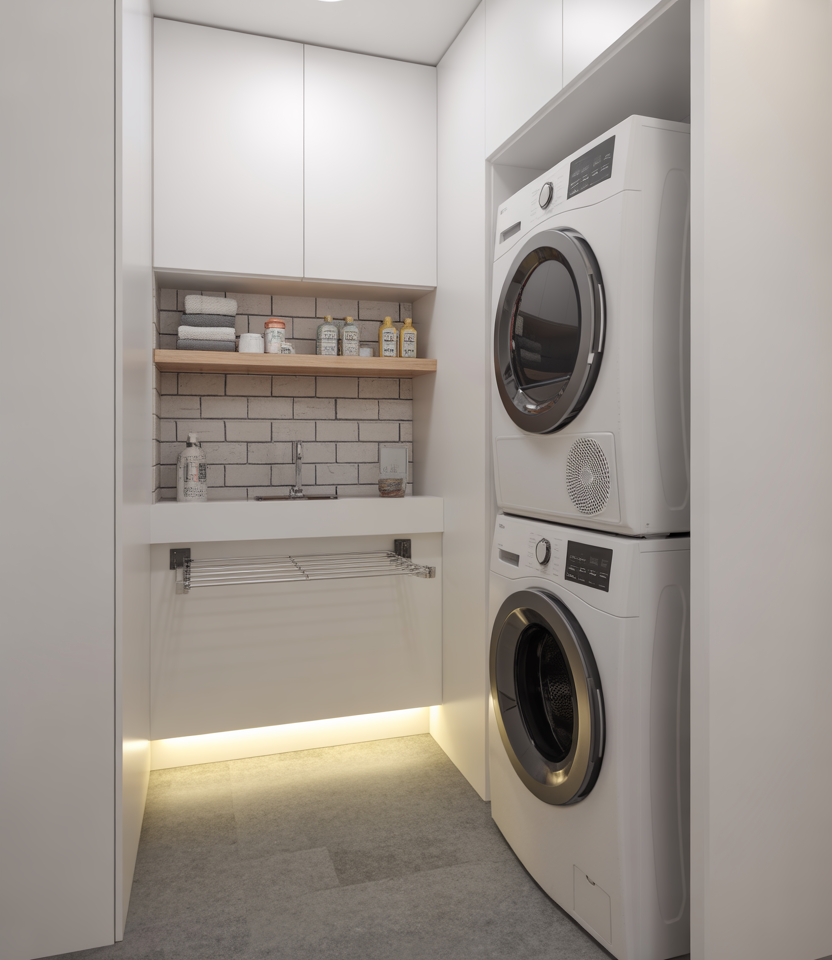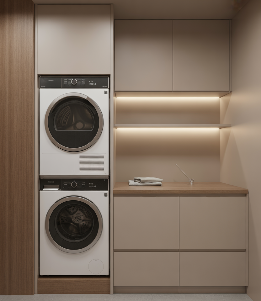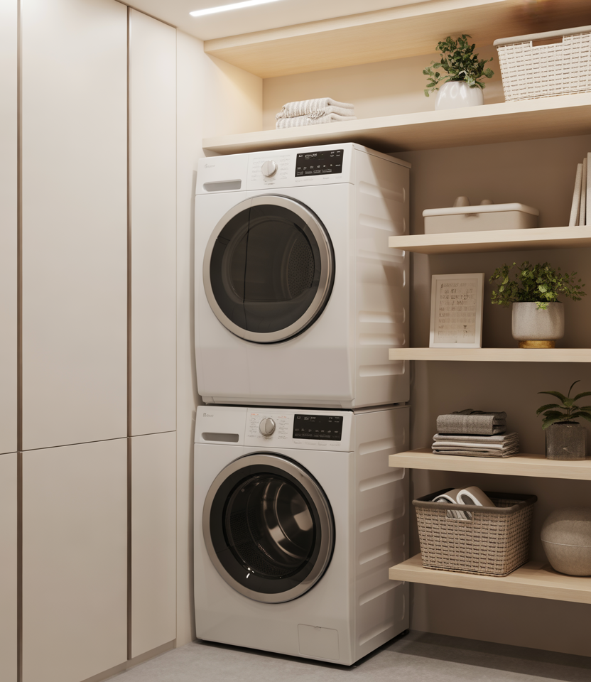 Designers predict that space, stackable, and organization trends will dominate 2026 as more homeowners turn to stacked solutions. Using stacked machines or a stacked washer-dryer frees up valuable floor space, making the layout feel less cramped. This idea works well in hallways, closets, or compact utility rooms where every inch counts.