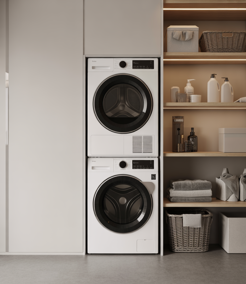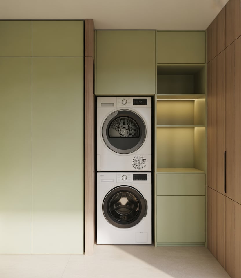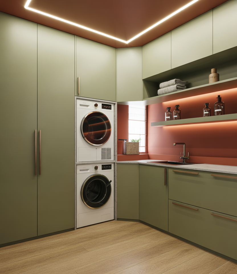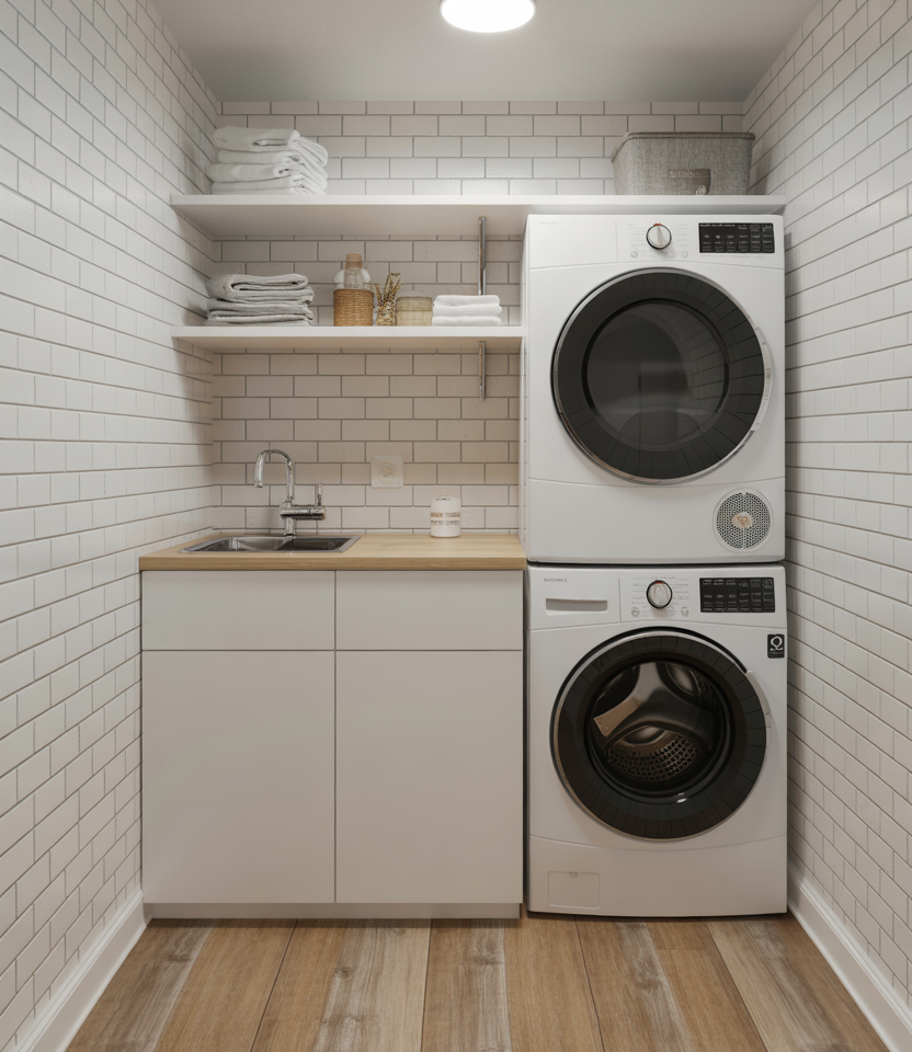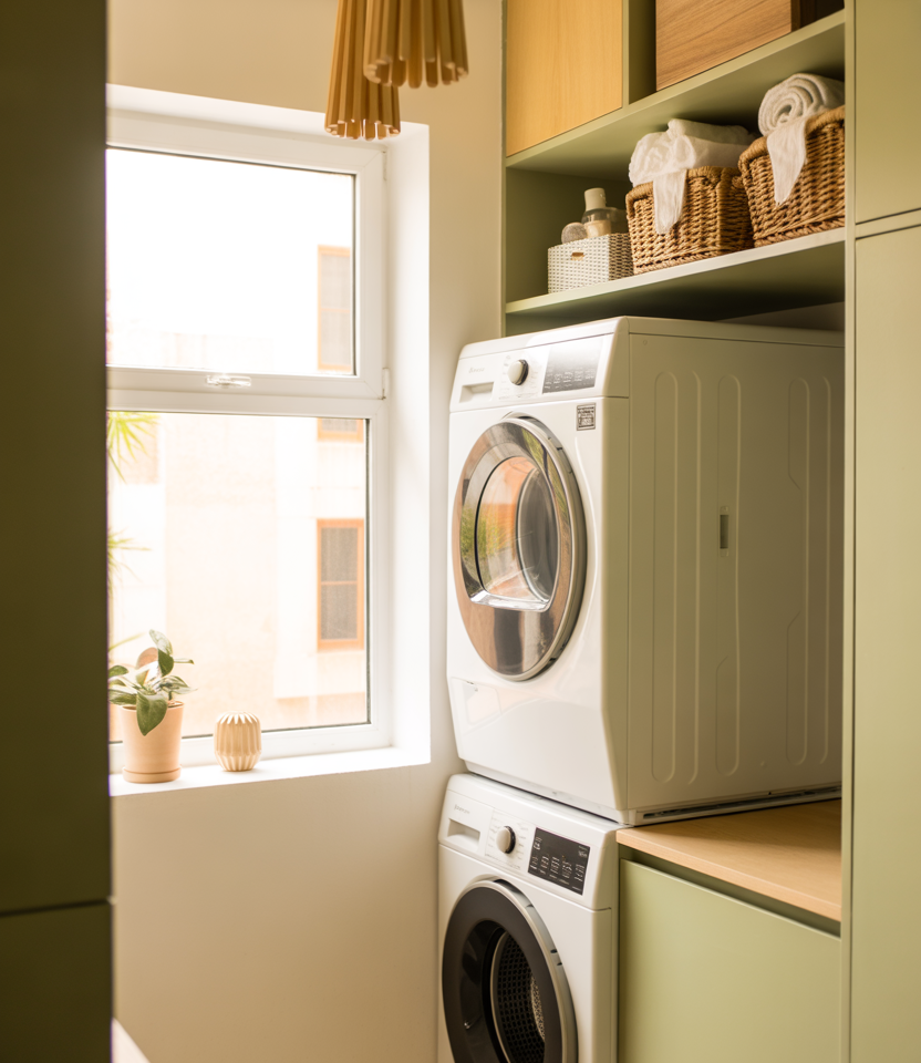Designers predict that space, stackable, and organization trends will dominate 2026 as more homeowners turn to stacked solutions. Using stacked machines or a stacked washer-dryer frees up valuable floor space, making the layout feel less cramped. This idea works well in hallways, closets, or compact utility rooms where every inch counts.