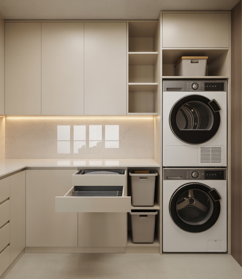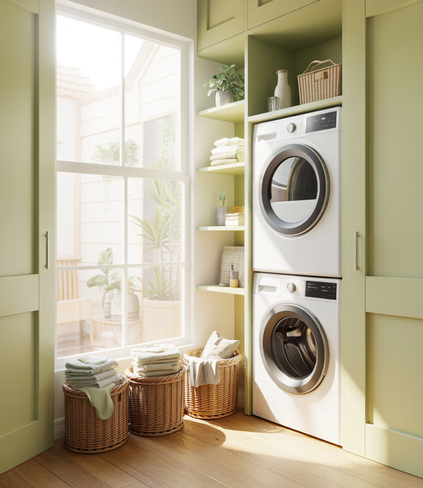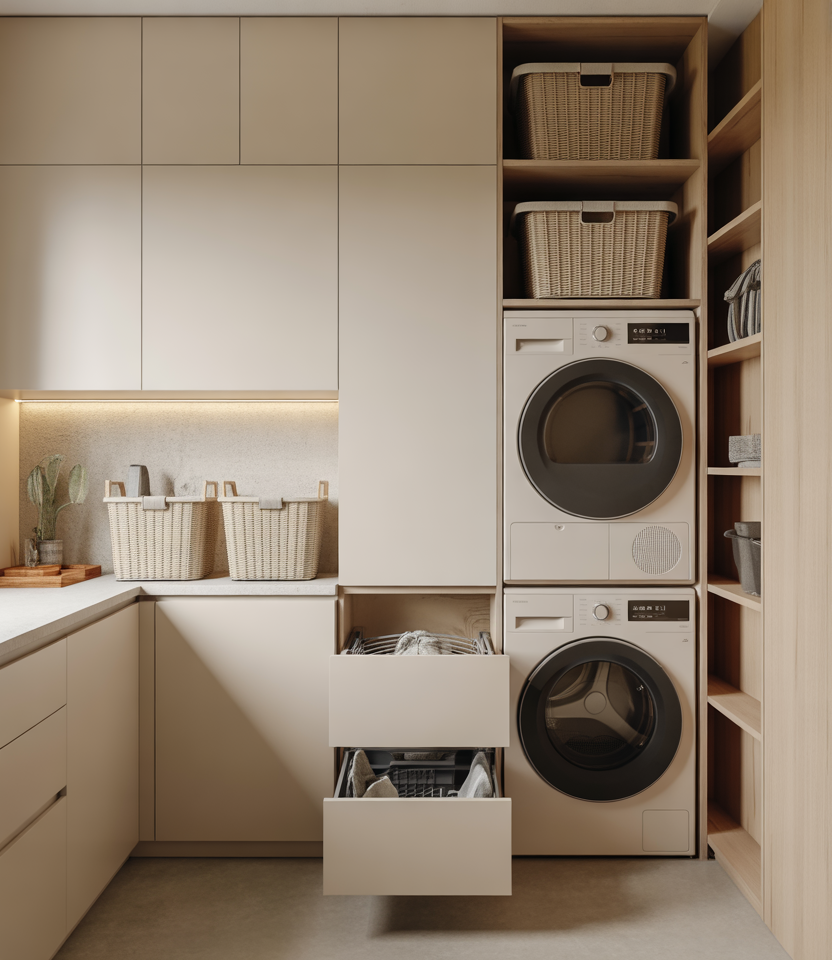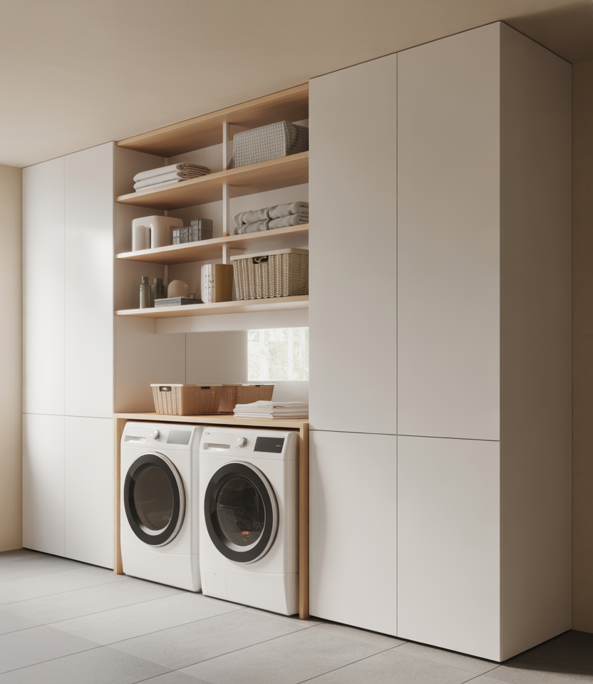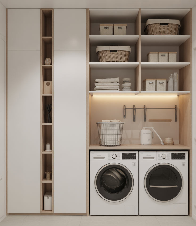 Creative Design’s stackable shelving helps expand vertical usability in tight rooms. Combining open shelves with baskets improves organization, especially above a washer-dryer pair. This approach suits both modern apartments and small suburban homes, which aim to make daily chores easier and visually cleaner.