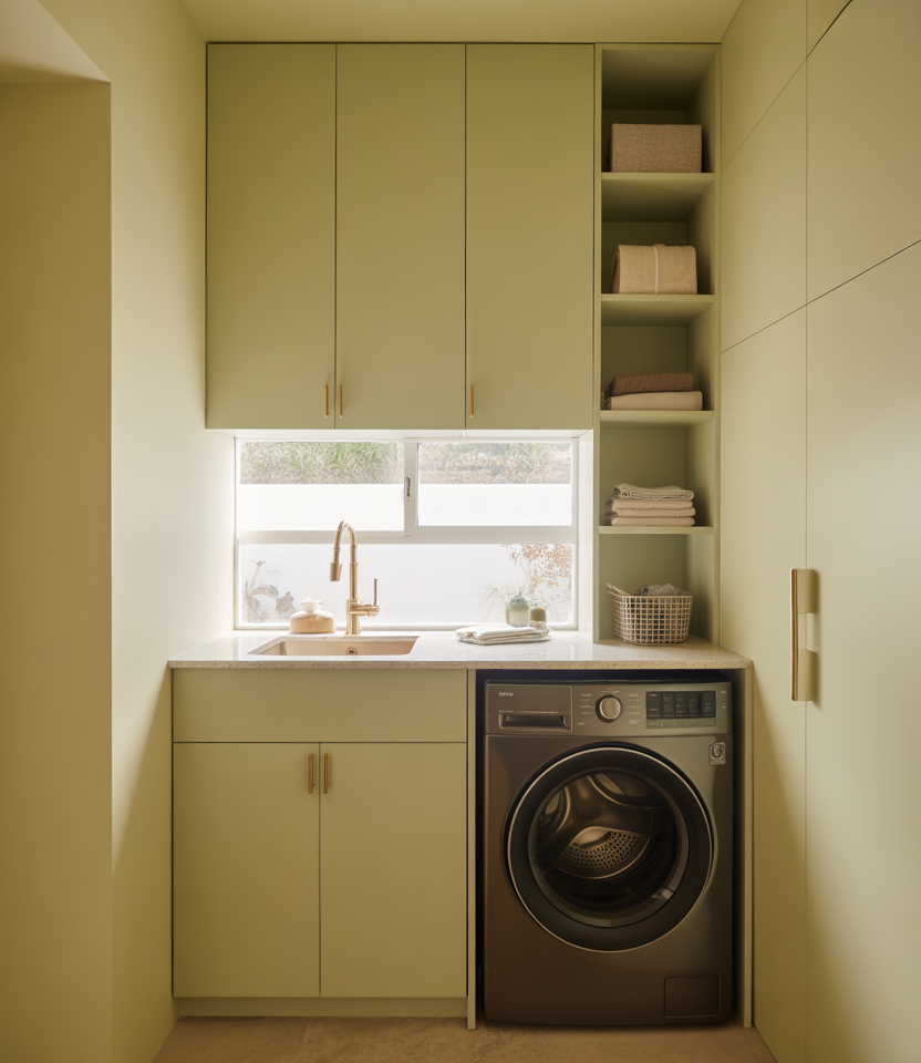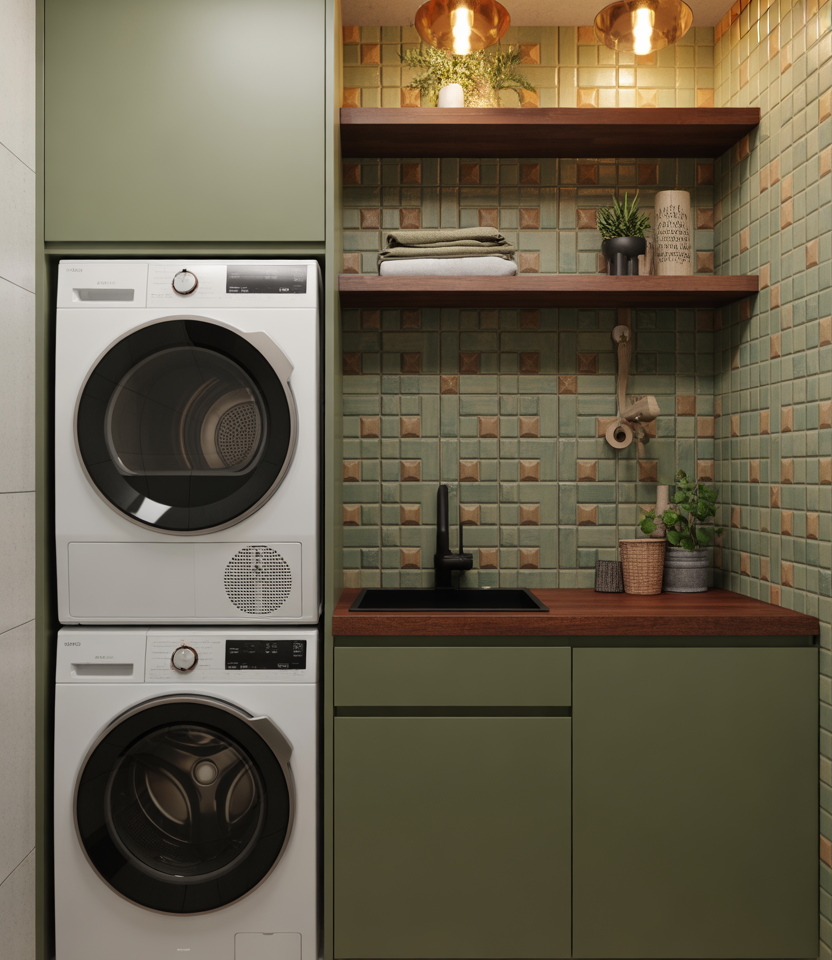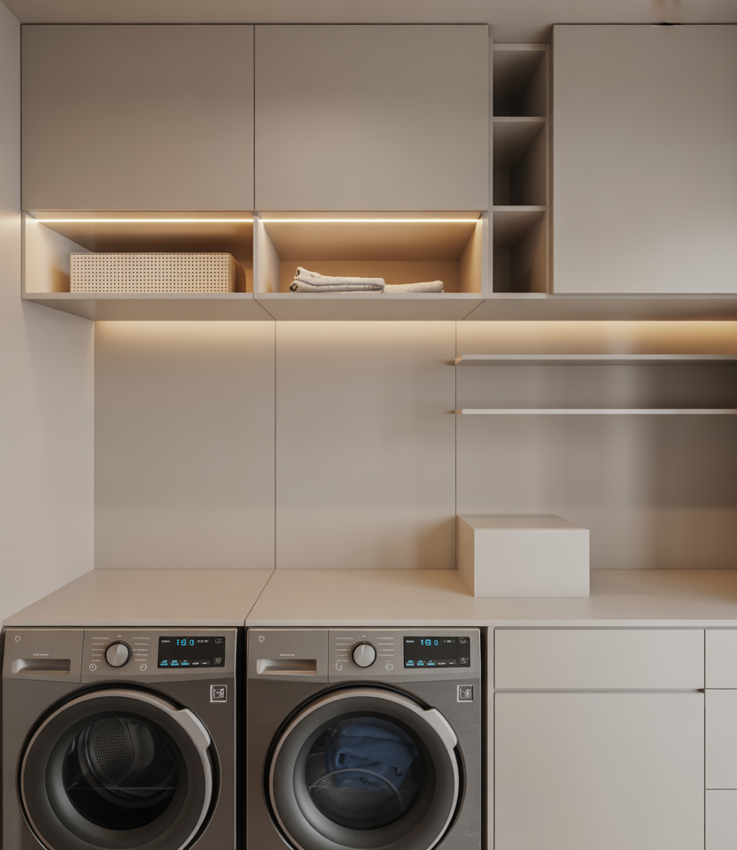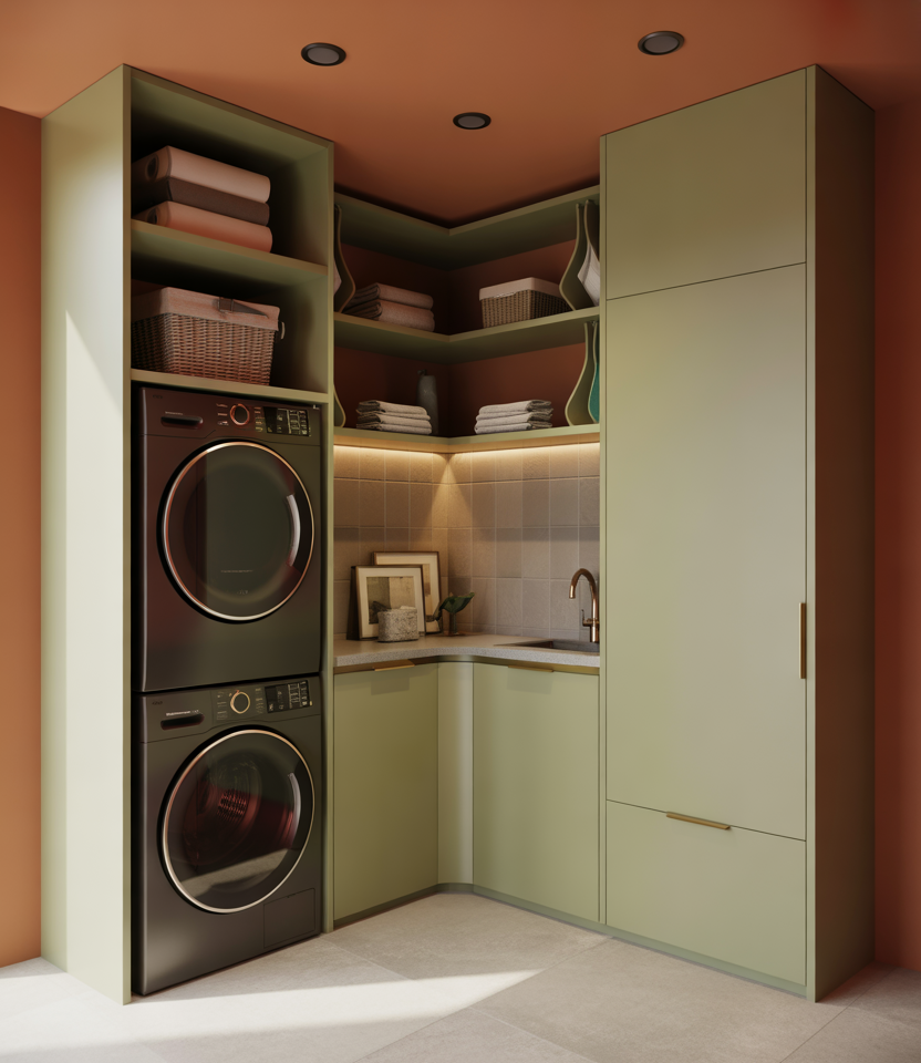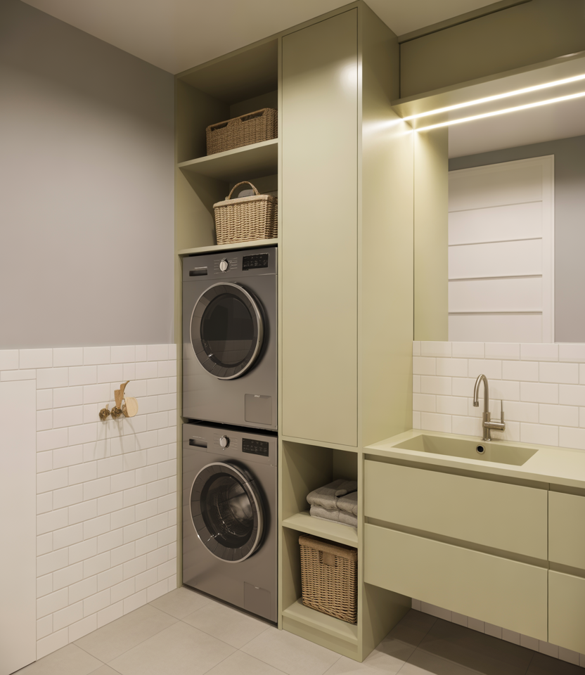 Creative Design’s stackable shelving helps expand vertical usability in tight rooms. Combining open shelves with baskets improves organization, especially above a washer-dryer pair. This approach suits both modern apartments and small suburban homes, which aim to make daily chores easier and visually cleaner.