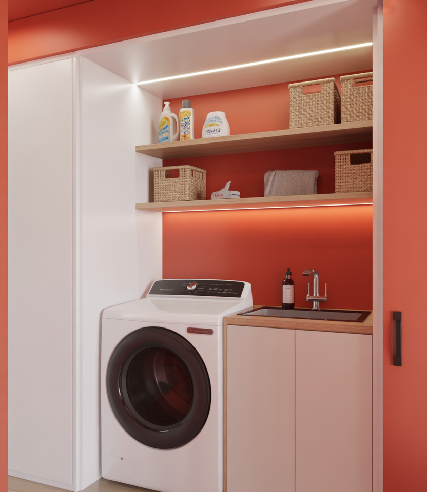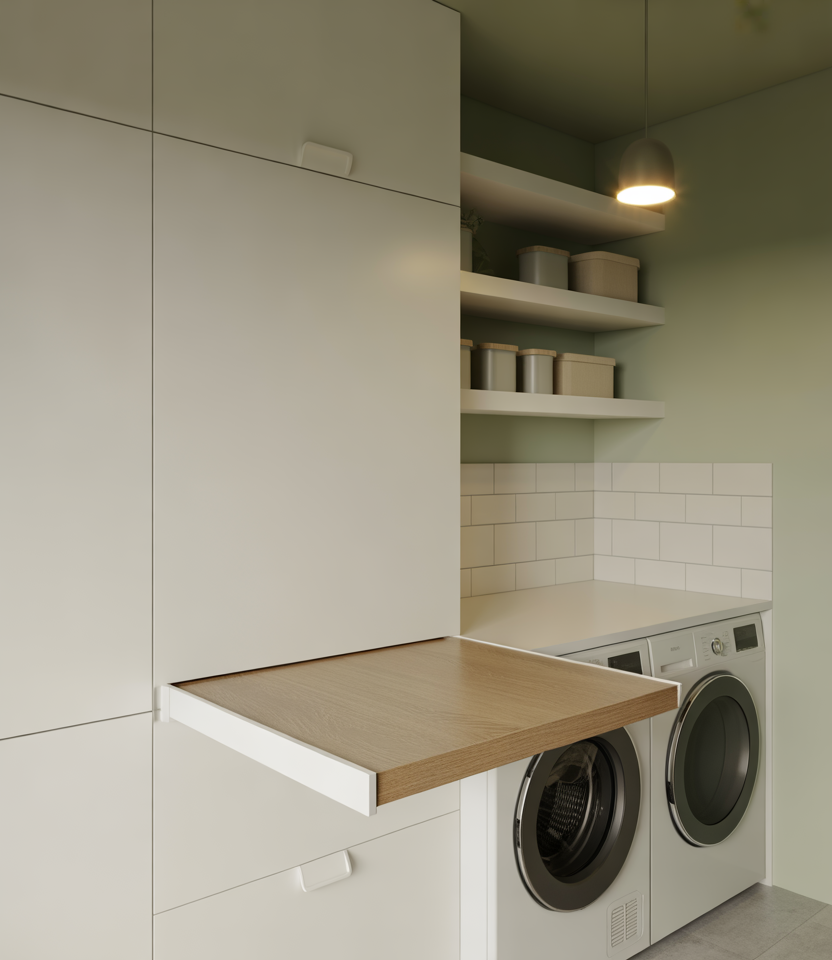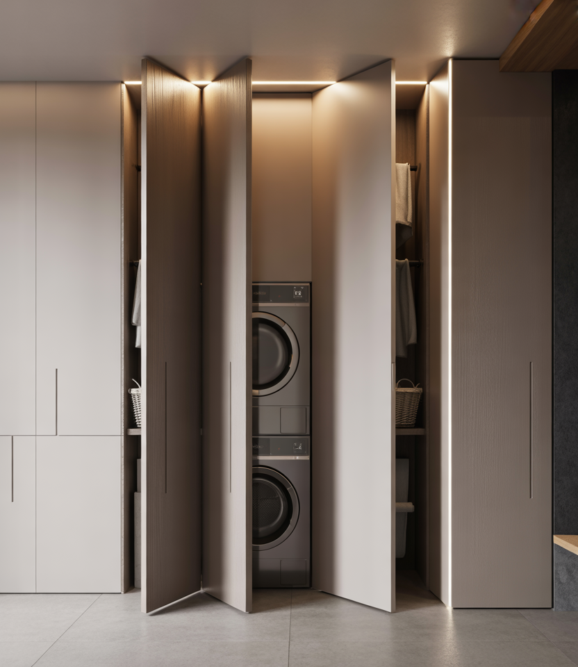 A fold-away laundry wall uses retractable panels to conceal appliances, creating an innovative makeover, efficient organization, and modern space usage. When closed, it resembles built-in cabinetry; when open, it becomes a functional workspace. This design is particularly suitable for lofts or multipurpose rooms that require visual simplicity.