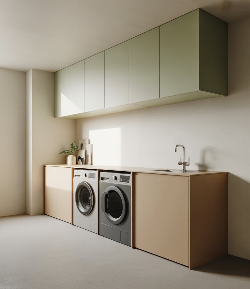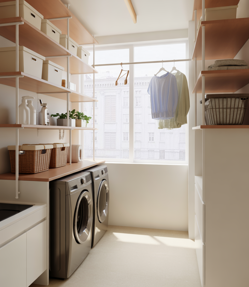 For households needing more storage, a high-shelf system utilizes vertical space while maintaining simple organization. Positioned above appliances, these shelves provide room for detergents and baskets without crowding the footprint. This solution is ideal for studios, small cottages, or secondary laundry zones.
