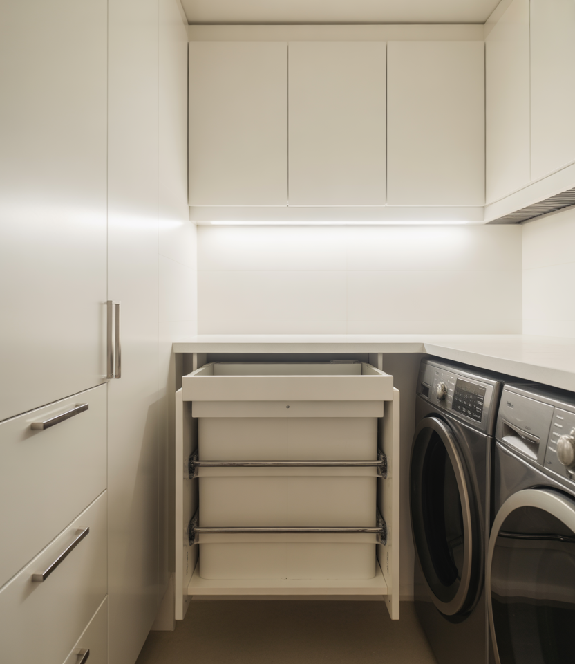 A pull-out hamper cabinet enhances organization, supports efficient design, and reduces clutter in tight areas. These systems keep clothes sorted and floors clear, making them perfect for townhouses or family homes with busy routines. The hidden storage keeps the room visually calm.