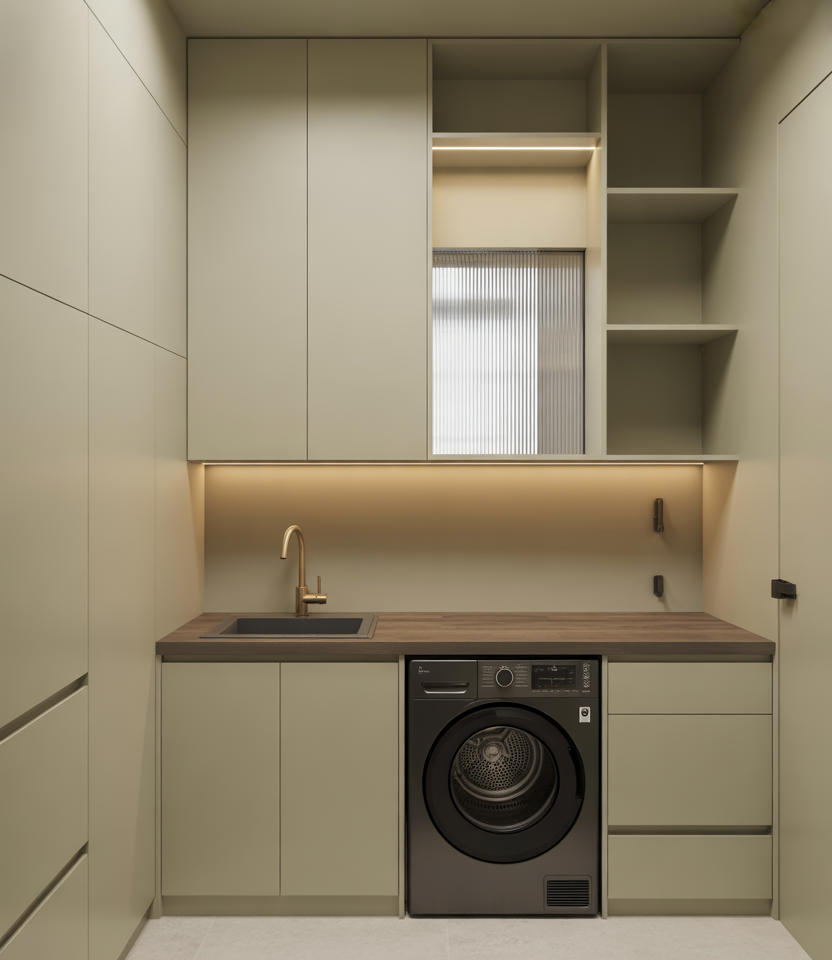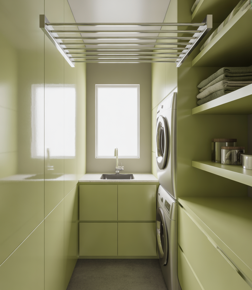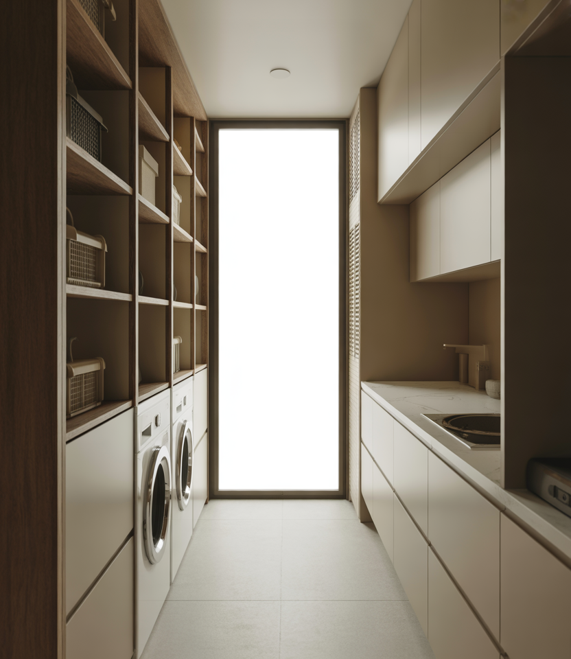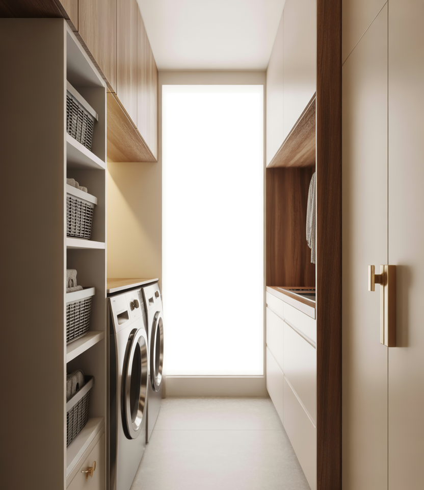 For homes with narrow corridors, a galley-style laundry can maximize space with stackable planning. Slim cabinets, a streamlined layout, and wall-mounted drying bars make these long rooms surprisingly efficient. Designers at Apartment Therapy often highlight how galley laundries thrive in older homes or condos with tight architectural constraints.