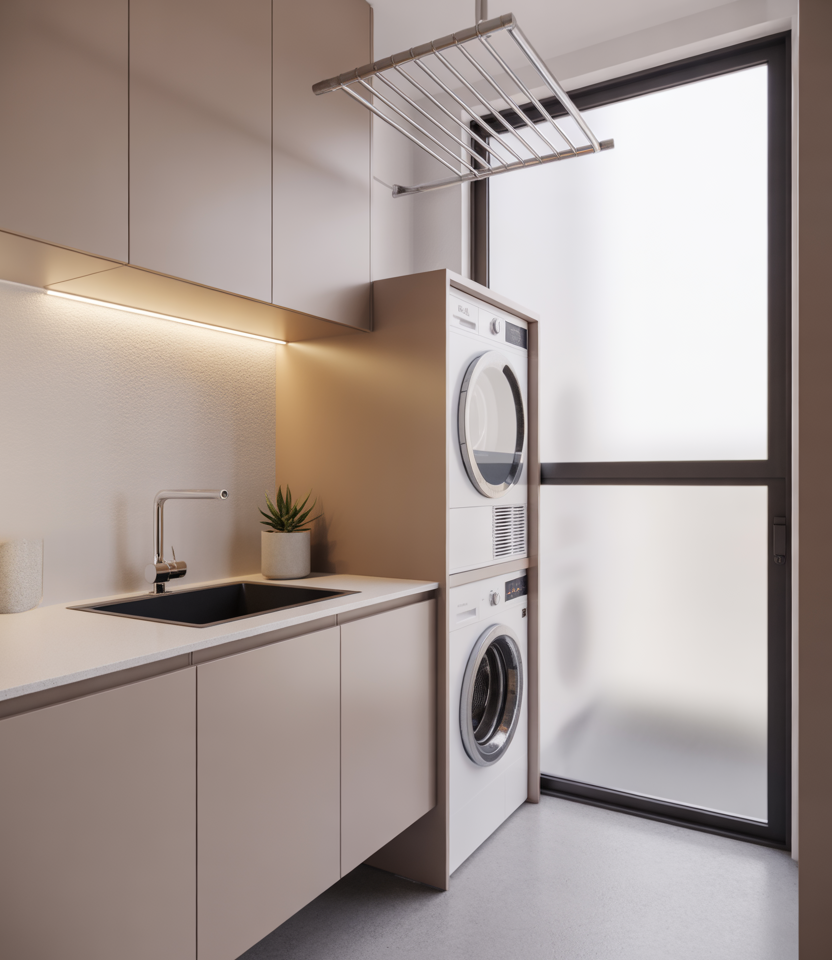 Compact laundries with a sink can benefit from adding a drying rod above it, improving organization and maximizing vertical space. This arrangement allows delicate items to drip dry neatly without occupying counters. It’s especially useful in climate-controlled homes where outdoor drying isn’t feasible.