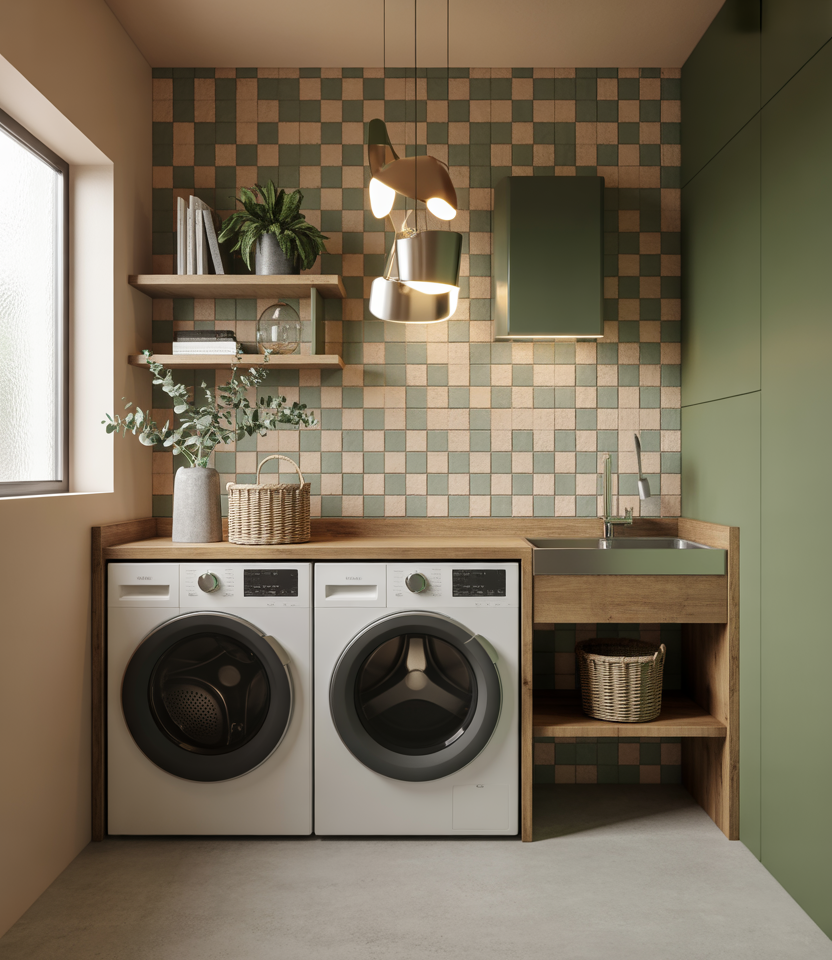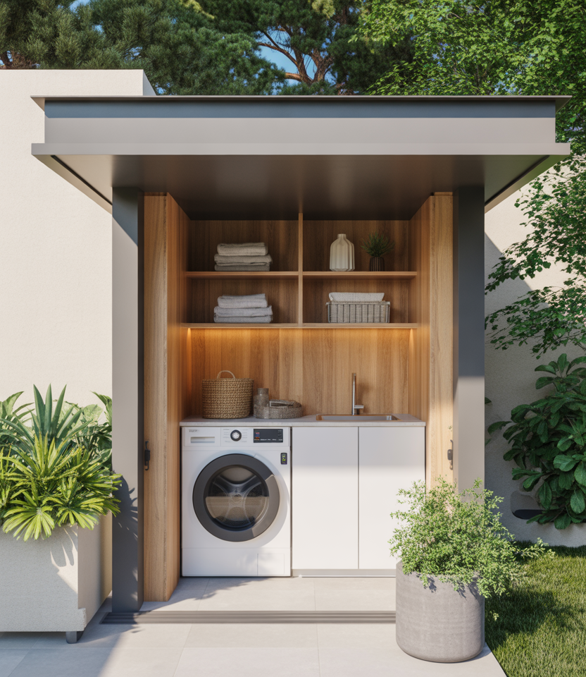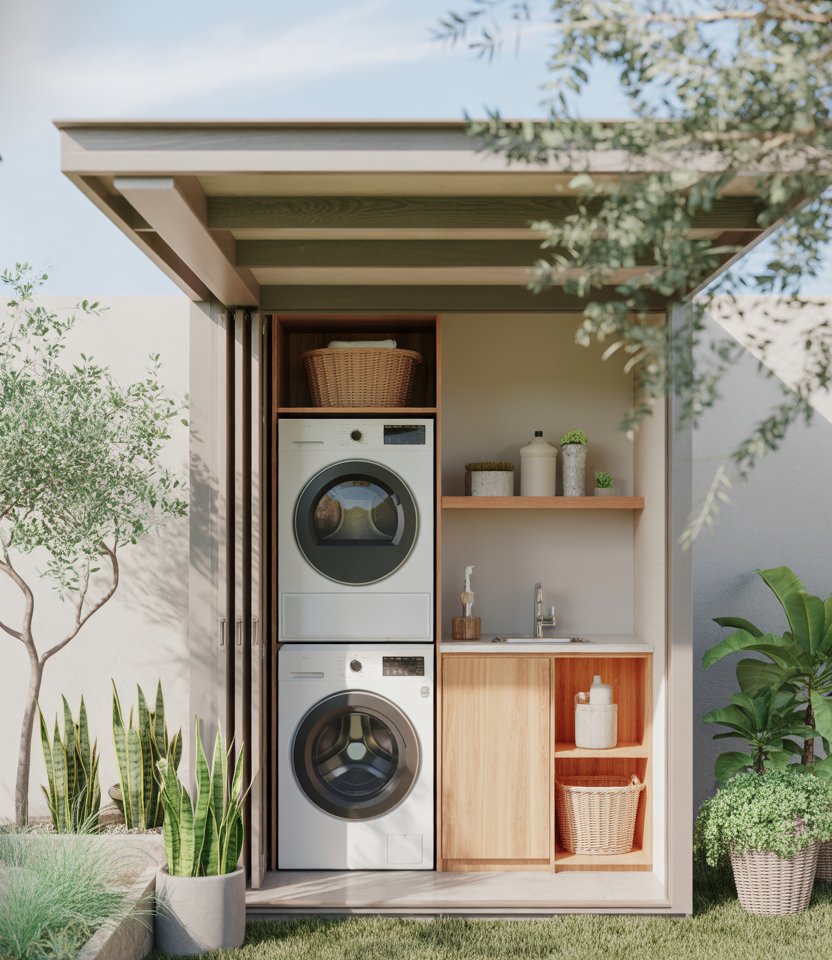 Where interior square footage is limited, an outdoor-adjacent laundry niche becomes a practical alternative. With proper enclosure and insulation, this setup allows for easy ventilation and extra storage options. Homeowners in warmer climates especially appreciate this idea because it keeps noise and heat away from indoor living areas.