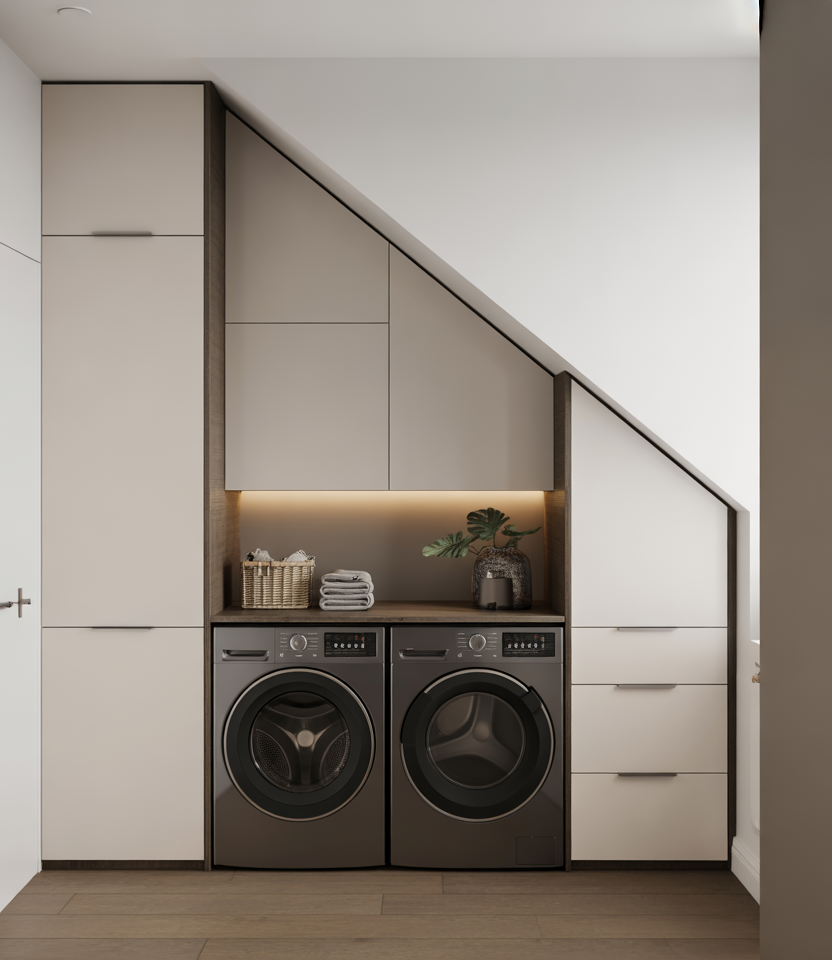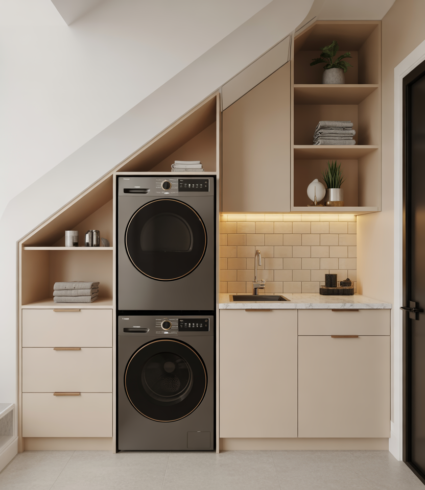 Placing appliances beneath a staircase creates a clever layout, smart storage, and a cost-effective makeover. Sloped ceilings are ideal for side-by-side or compact stacked units, especially in multilevel homes. This approach is increasingly popular among renovators seeking to turn previously dead space into a functional laundry zone.