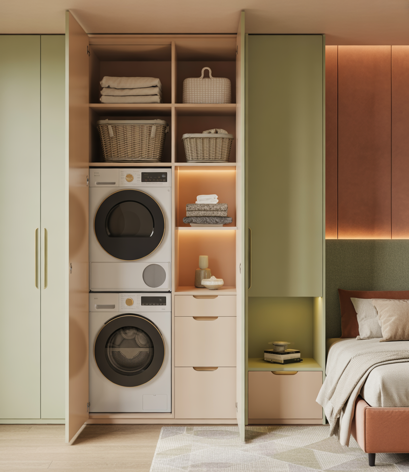 Integrating a small laundry closet into a bedroom suite adds daily convenience, a streamlined layout, and thoughtful design. With quiet appliances and strategic storage, this setup fits micro-apartments or compact new builds. It keeps chores close to living spaces while blending into the room’s overall aesthetic.