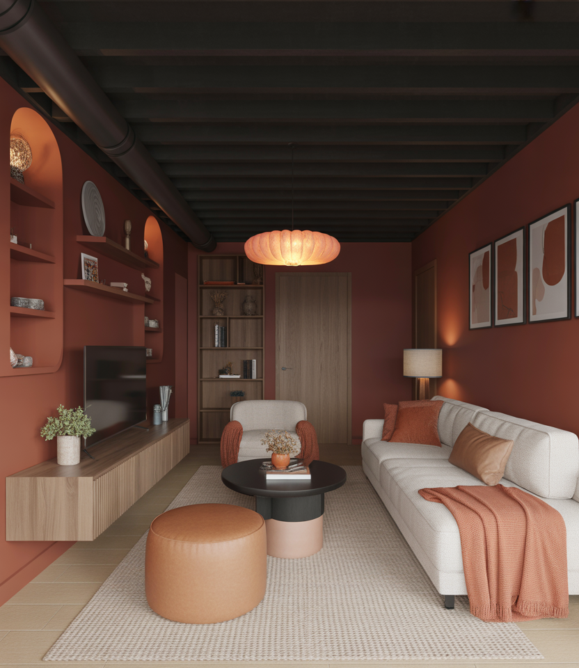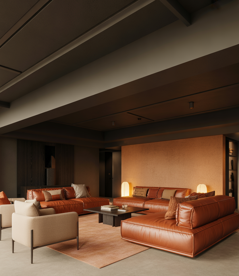 The black ceiling trend is redefining basement comfort. Painting the ceiling dark can make a low space feel intimate rather than confined. Pair it with warm color palettes—terracotta, beige, or muted greens—and soft furniture options like oversized sofas and plush rugs. It’s an effortless, inexpensive way to elevate your basement aesthetics while hiding ductwork and imperfections.