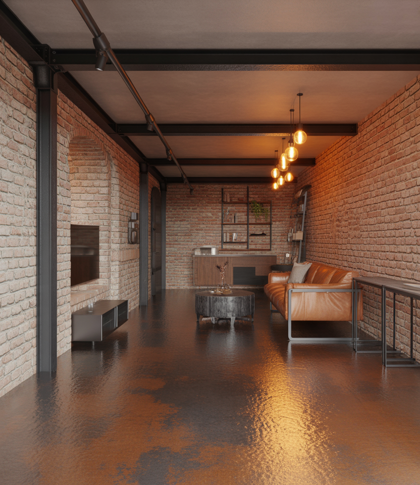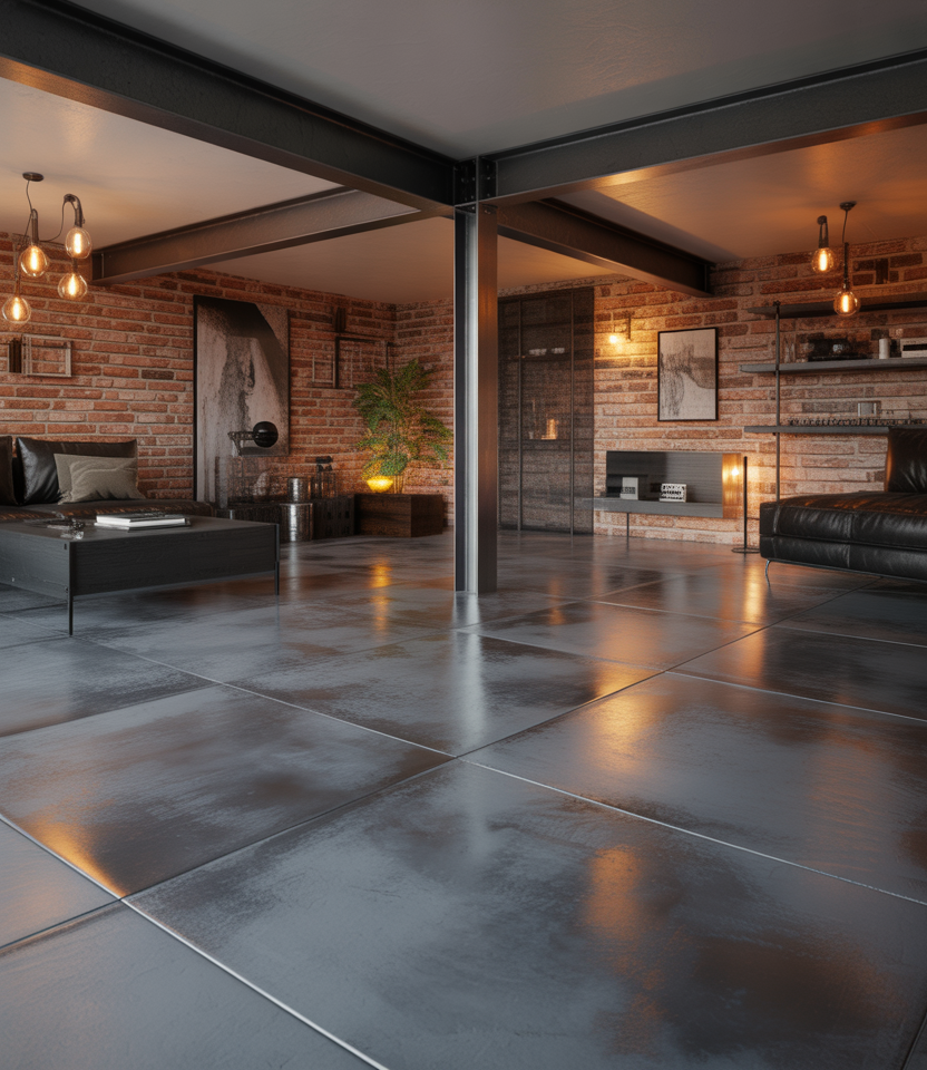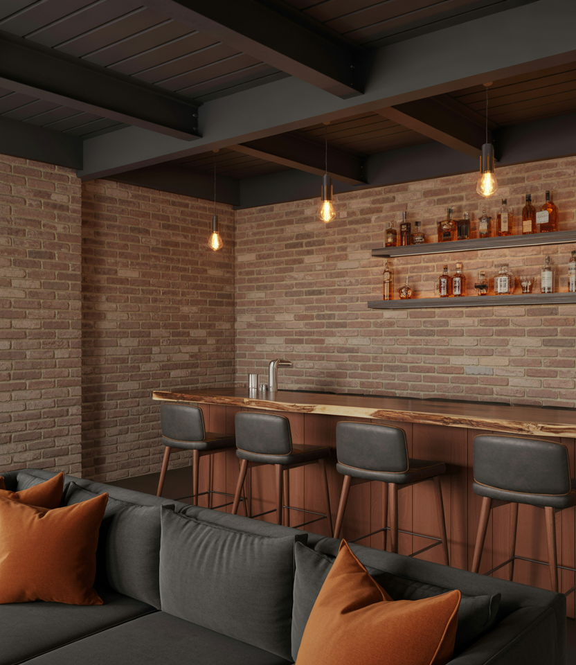 If your unfinished basement feels too raw, embrace it. Exposed beams, brick walls, and matte metal accents turn flaws into features. Combine ideas with stained concrete floors and warm Edison lighting for an authentic loft vibe. This inexpensive transformation works especially well in split-level homes, giving the space a stylish, urban edge that feels both rugged and artistic.