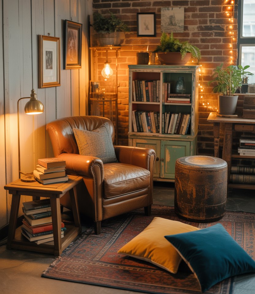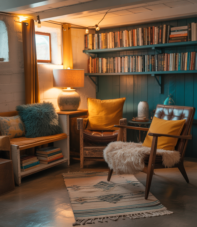 Turn a corner of your unfinished basement into a cozy reading escape. Mix patterns, mismatched furniture options, and warm color palettes like mustard or teal. This easy project is perfect for book lovers who crave quiet and personality. Add layered rugs and floor lamps for ambiance—proof that comfort doesn’t need to be expensive.