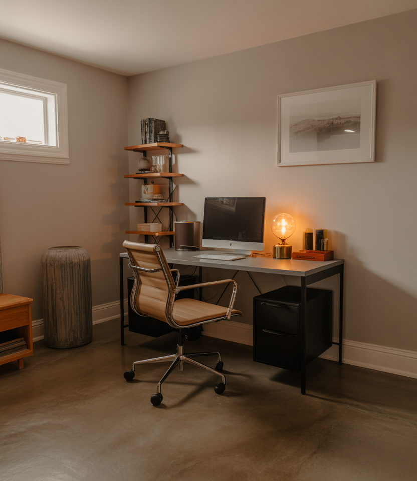 For those who love an industrial twist, a basement office featuring ideas with stained concrete floors offers sophistication and durability. Combine metal desks, wood shelving, and muted color palettes for balance. It’s an easy, low-maintenance option that stays stylish through trends—especially for professionals in Michigan working from home.