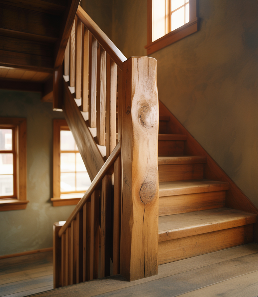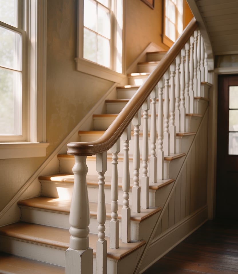 Classic rustic farmhouse stair railings are defined by familiarity and comfort rather than trend-driven statements. Turned wooden spindles paired with a sturdy handrail create a look that feels lived-in and welcoming. This style fits naturally inside traditional American homes, especially those with wide-plank floors and soft neutral palettes.