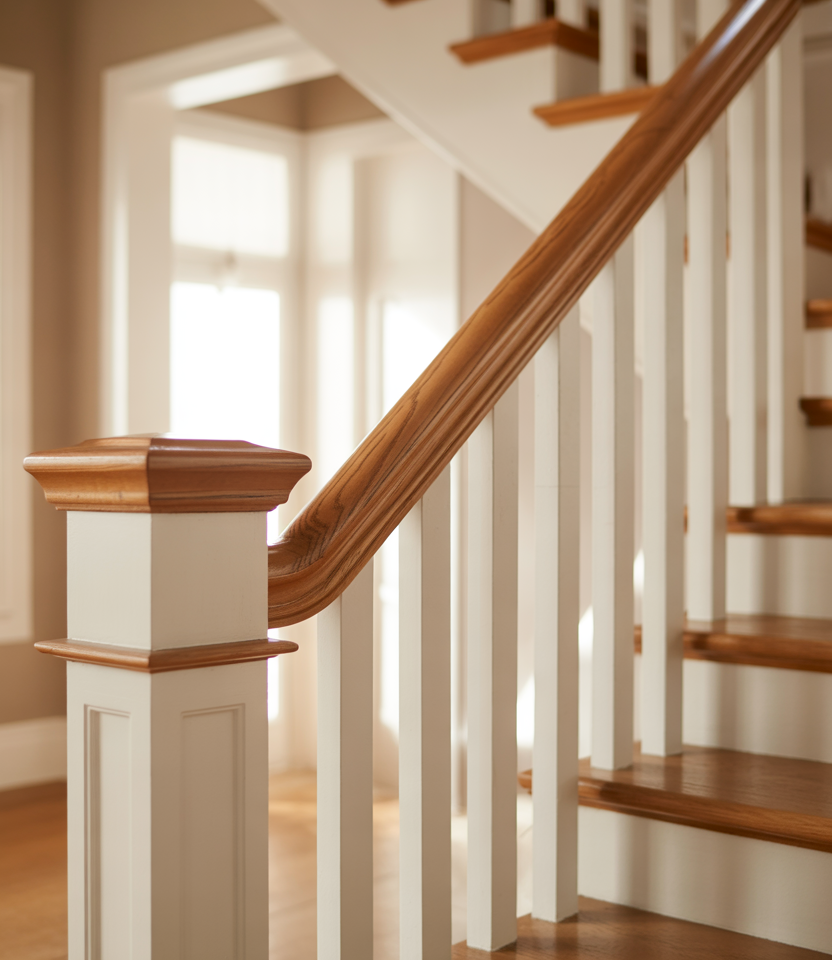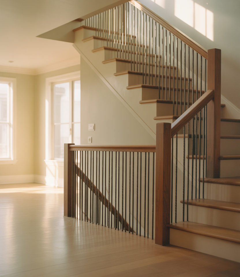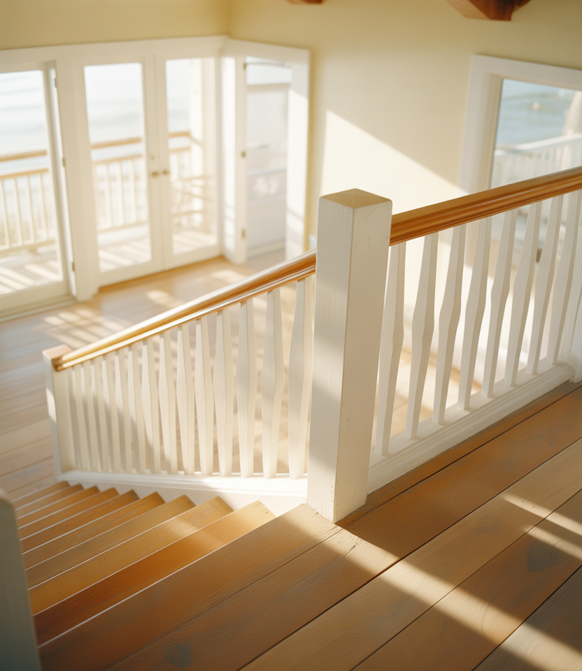 In coastal homes, stair railings tend to emphasize openness and ease. Light wood tones, wider spacing, and simple profiles keep the staircase feeling airy and relaxed. This style fits naturally inside beach houses and lakeside homes.