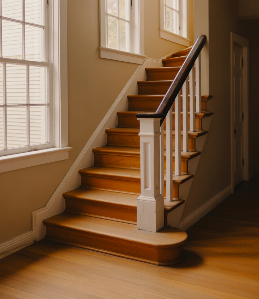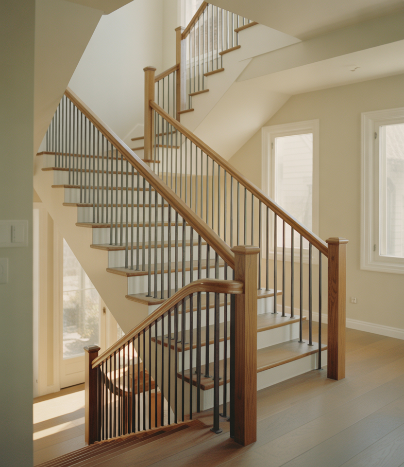 Mixing finishes has become more common in interior stair design. A wooden handrail paired with contrasting posts or subtle metal details feels intentional rather than mismatched. This approach bridges traditional and contemporary styles effortlessly.