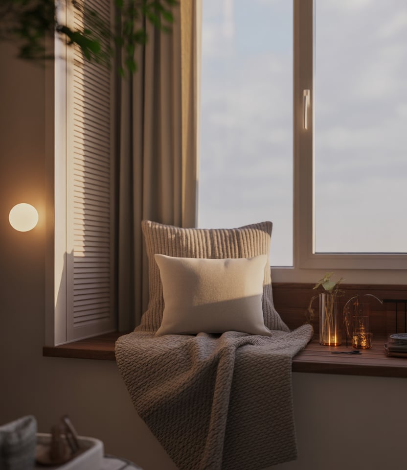 A tiny cozy window seat, nook invites quiet moments—coffee, journaling, or simply a breath between tasks. A slim bench cushion, layered throws, and low-profile lighting build emotional warmth without consuming space. This idea is perfect for renters with wide window sills or unused corners. Even design journalists rave about simple window seating as a daily-life upgrade.