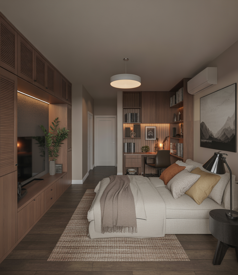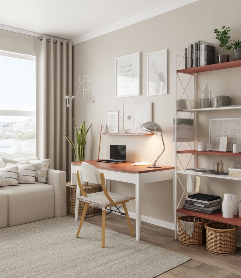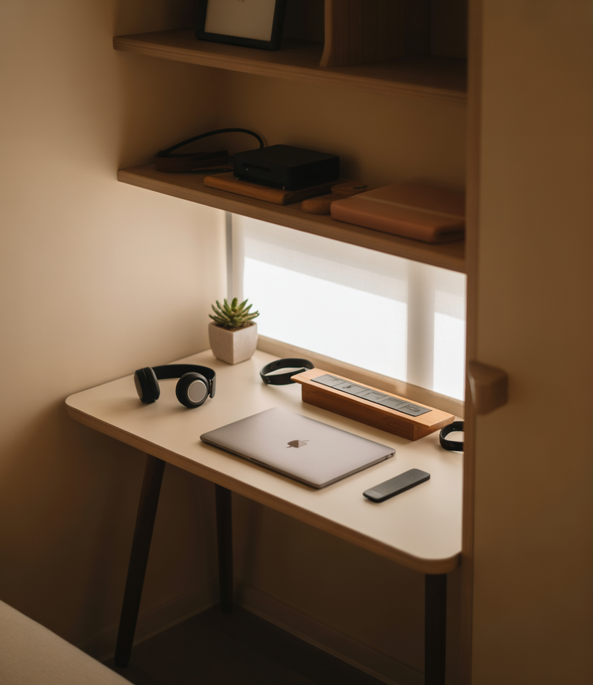 As work-from-home culture continues, micro workstations remain essential. A slim desk, wall shelf, or corner-mounted board can establish a productive zone without absorbing the entire room. This idea is perfect for those who juggle hybrid office schedules and need structure. A micro-station blends well with minimalist, Scandinavian-inspired setups while keeping clutter out of sight.