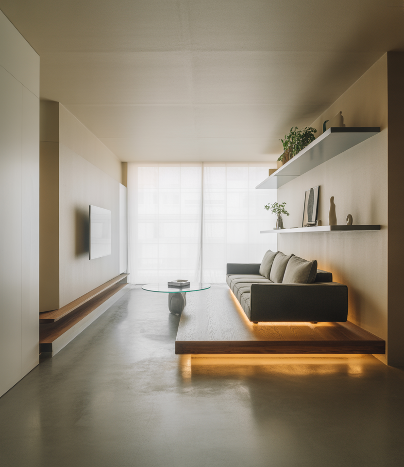 An elevated platform changes the entire layout of a studio by giving you a subtle second level without adding walls. This works especially well in tiny homes where vertical design becomes essential. The raised zone can host a bed, reading area, or hidden storage underneath, adding depth and character. Designers love this trick because it brings a natural flow to studios that otherwise feel flat, especially in spaces shaped like a long layout rectangle.