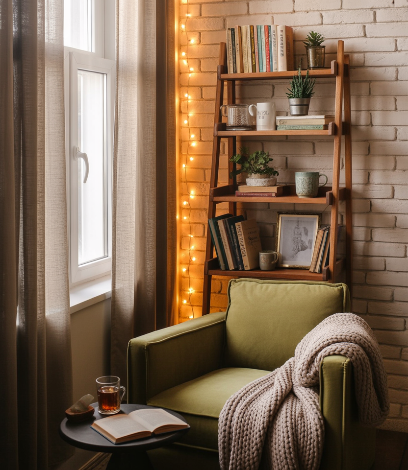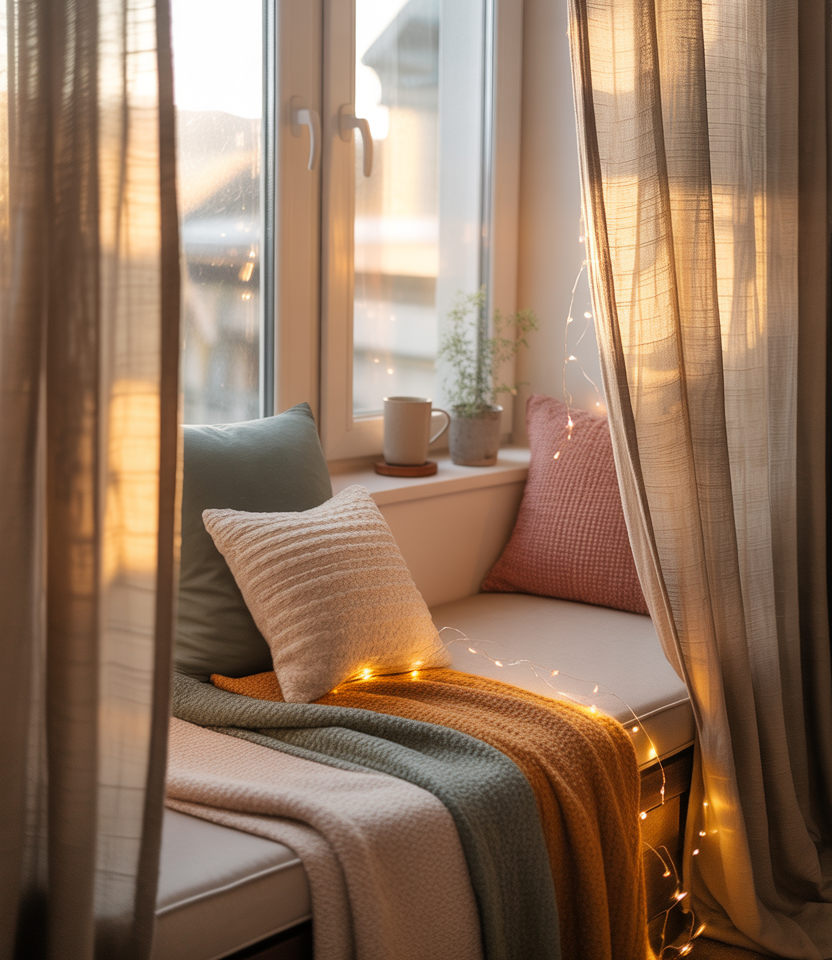 A tiny cozy window seat, nook invites quiet moments—coffee, journaling, or simply a breath between tasks. A slim bench cushion, layered throws, and low-profile lighting build emotional warmth without consuming space. This idea is perfect for renters with wide window sills or unused corners. Even design journalists rave about simple window seating as a daily-life upgrade.