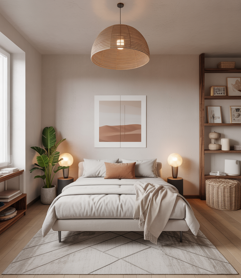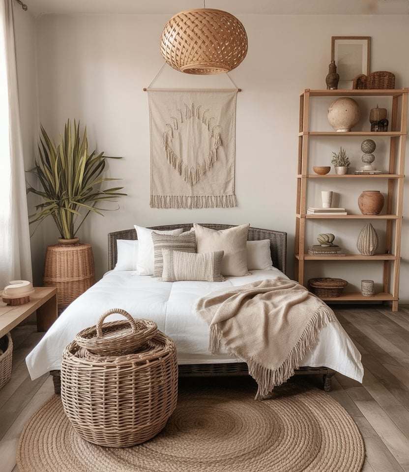 A Bohemian studio with rustic accents—woven baskets, linen throws, handmade ceramics—creates a relaxed atmosphere that feels both stylish and personal. This look works in any layout plan and adapts beautifully to renters who love expressive, collected décor.