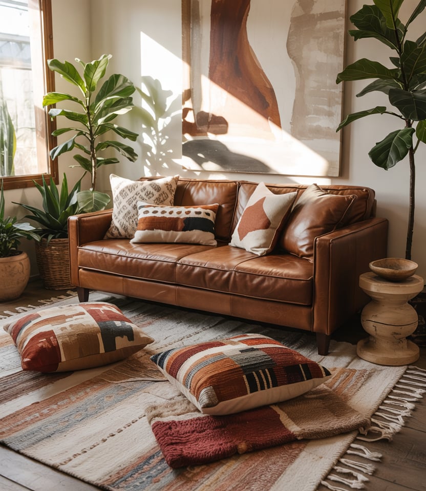 For a relaxed vibe, a brown sofa fits beautifully into a boho aesthetic. Think global textiles, oversized plants, and natural materials. A bohemian leather finish or warm red and rust accents bring a collected, worldly feel that never looks too staged.