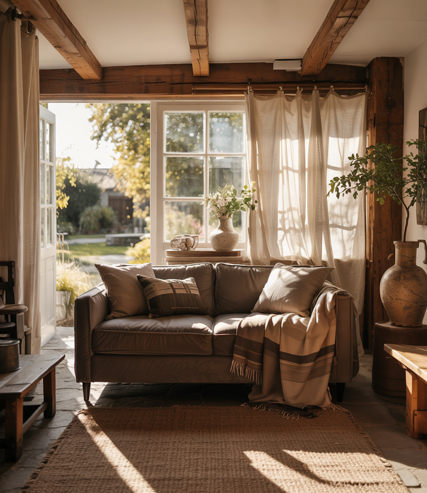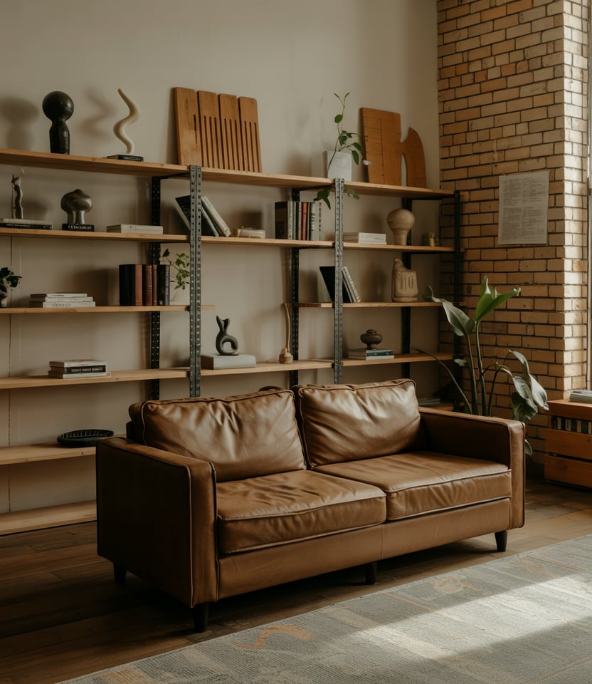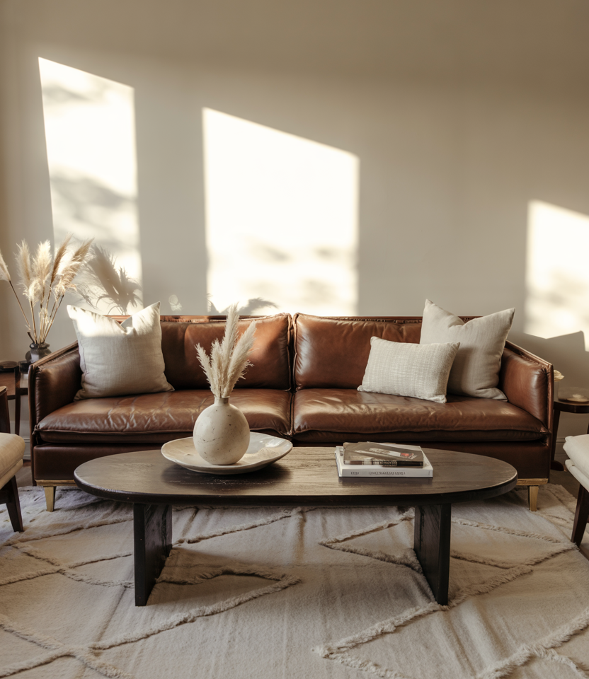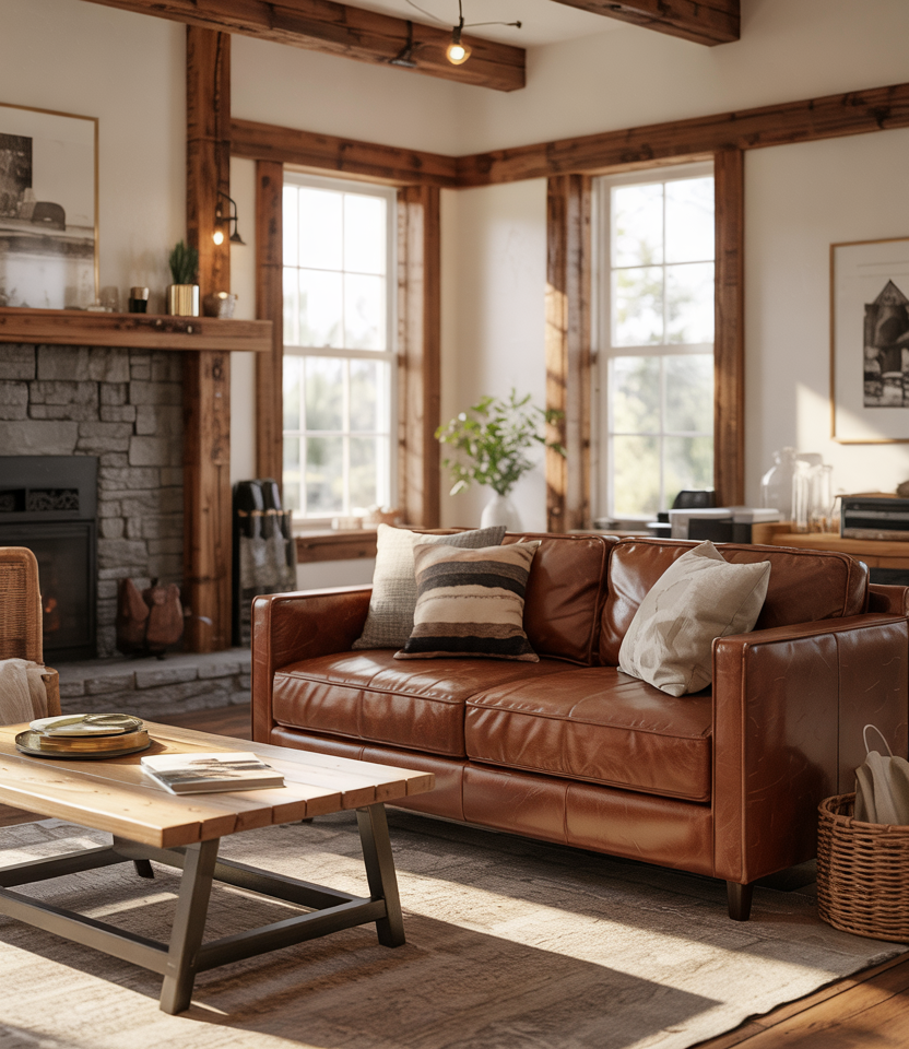 For those drawn to earthy design, a brown leather sofa sets the stage. Pairing it with weathered wood, woven baskets, and rugged textures fits naturally with rustic homes or weekend cabins. A space grounded in warm browns instantly feels connected to nature.