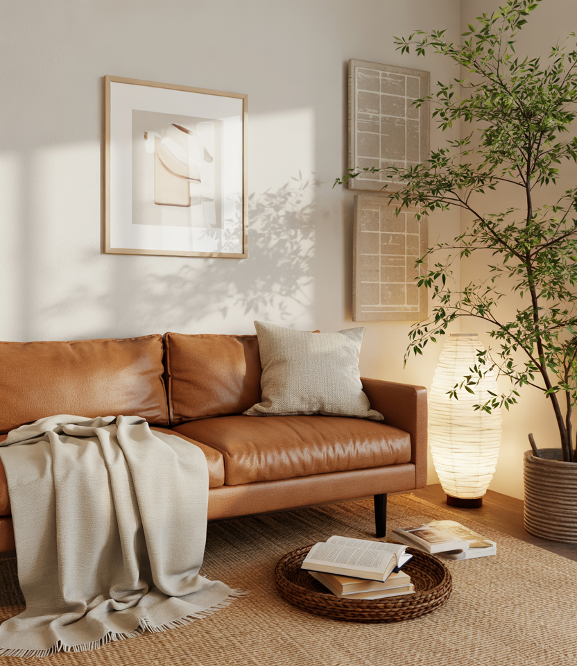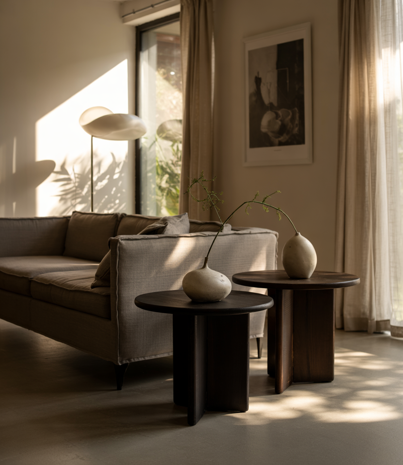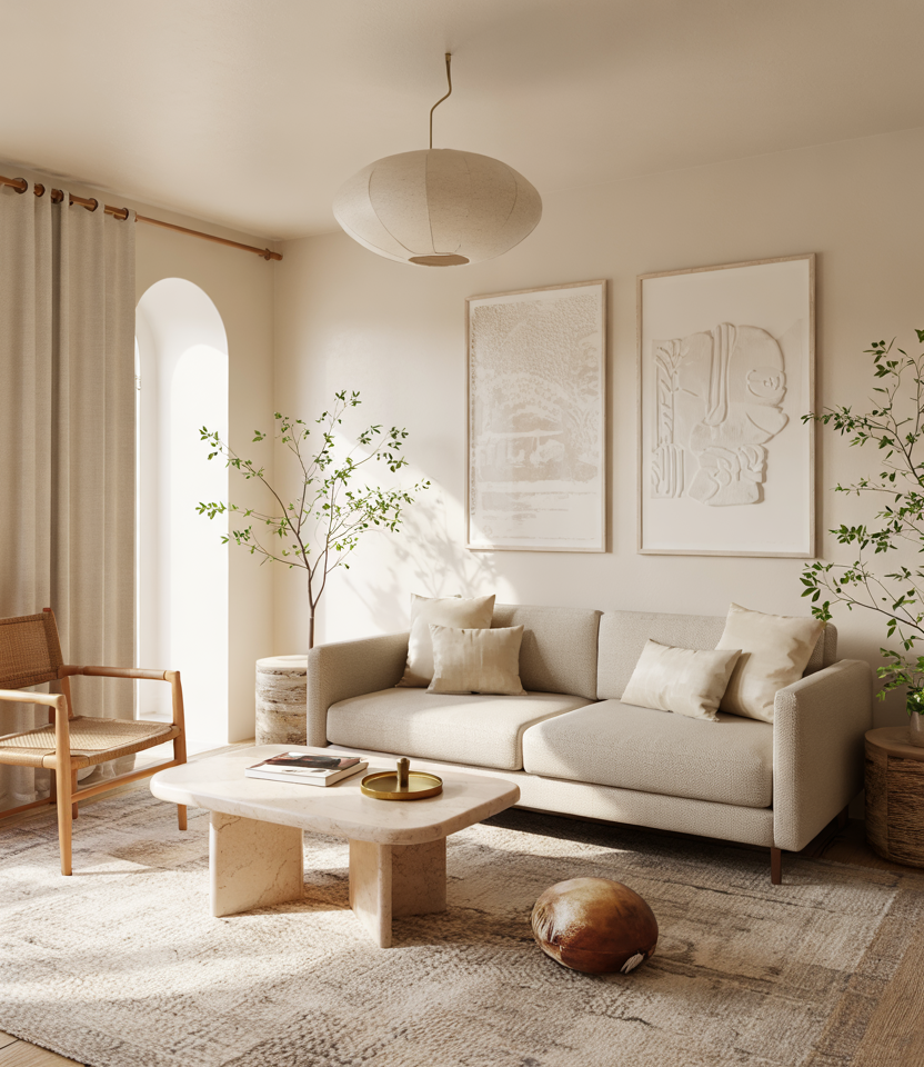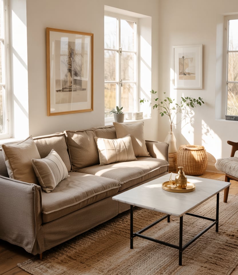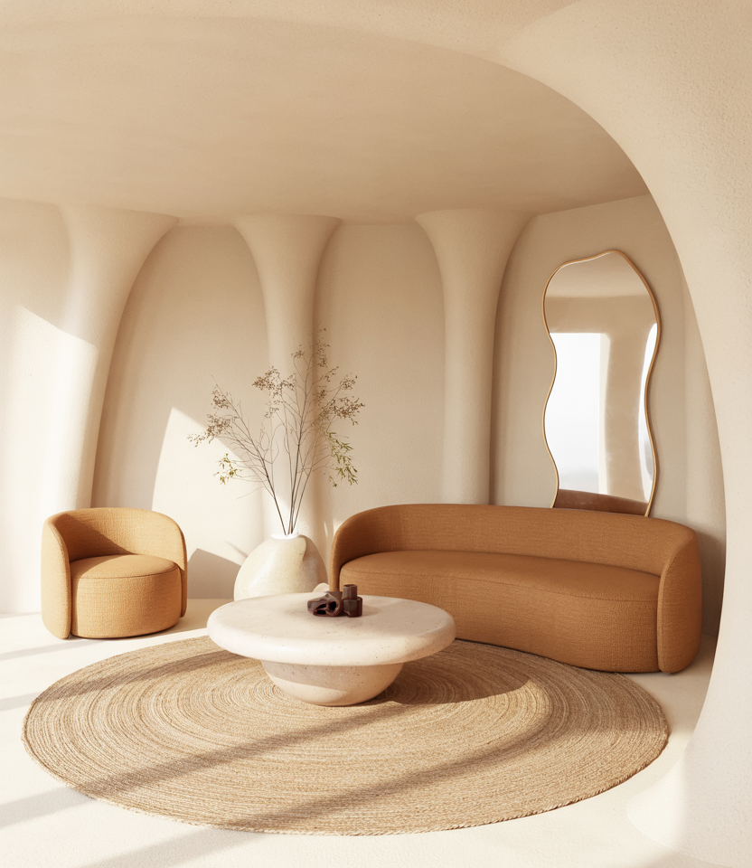 A tan-toned brown sofa blends seamlessly with curvy furniture and sculptural pieces. Incorporating soft forms—like round poufs or wavy mirrors—enhances the calming effect of tan and airy light elements. The result is a welcoming space with gentle movement.