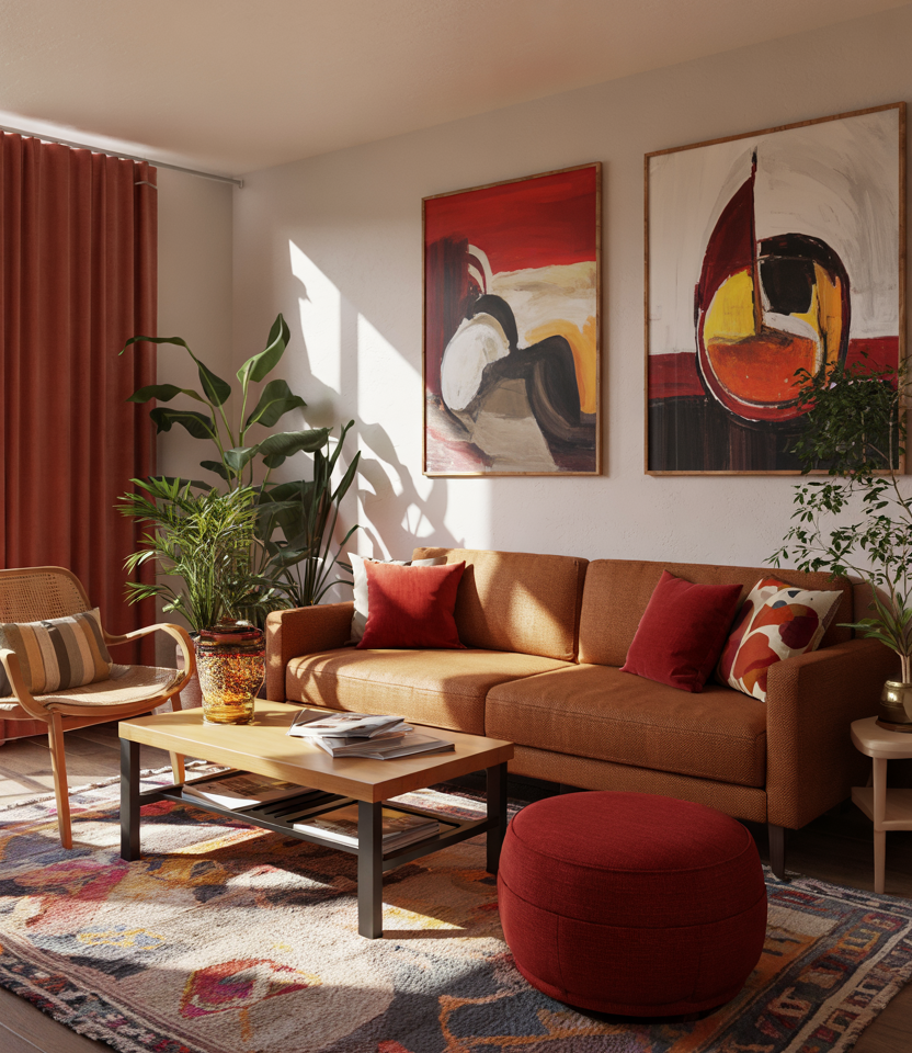Brown sofas love boldness, especially when paired with unexpected colors. Deep accents in red or earthy rust tones add warmth and dimension without overwhelming the space. This eclectic mix suits homes that enjoy playful patterns and expressive décor choices.