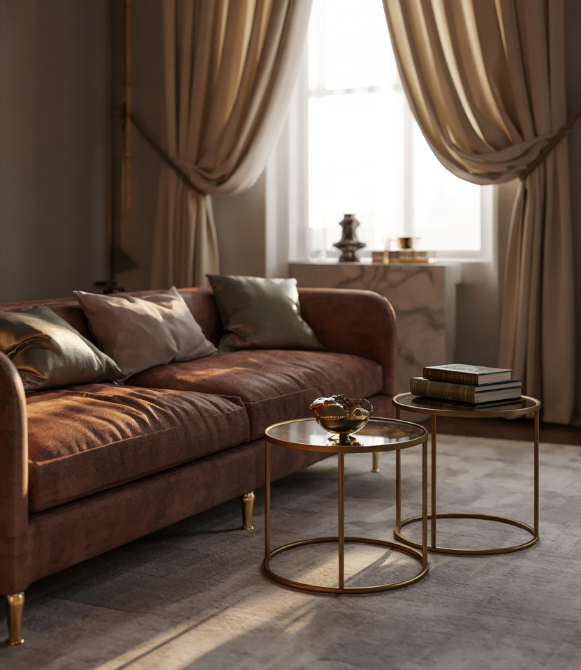 For a touch of glamour, a brown sofa dressed in velvet brings richness and drama. The fabric’s sheen pairs beautifully with brass accents and moody lighting, creating a layered look that feels both modern and indulgent. It’s an elevated take on everyday essentials.