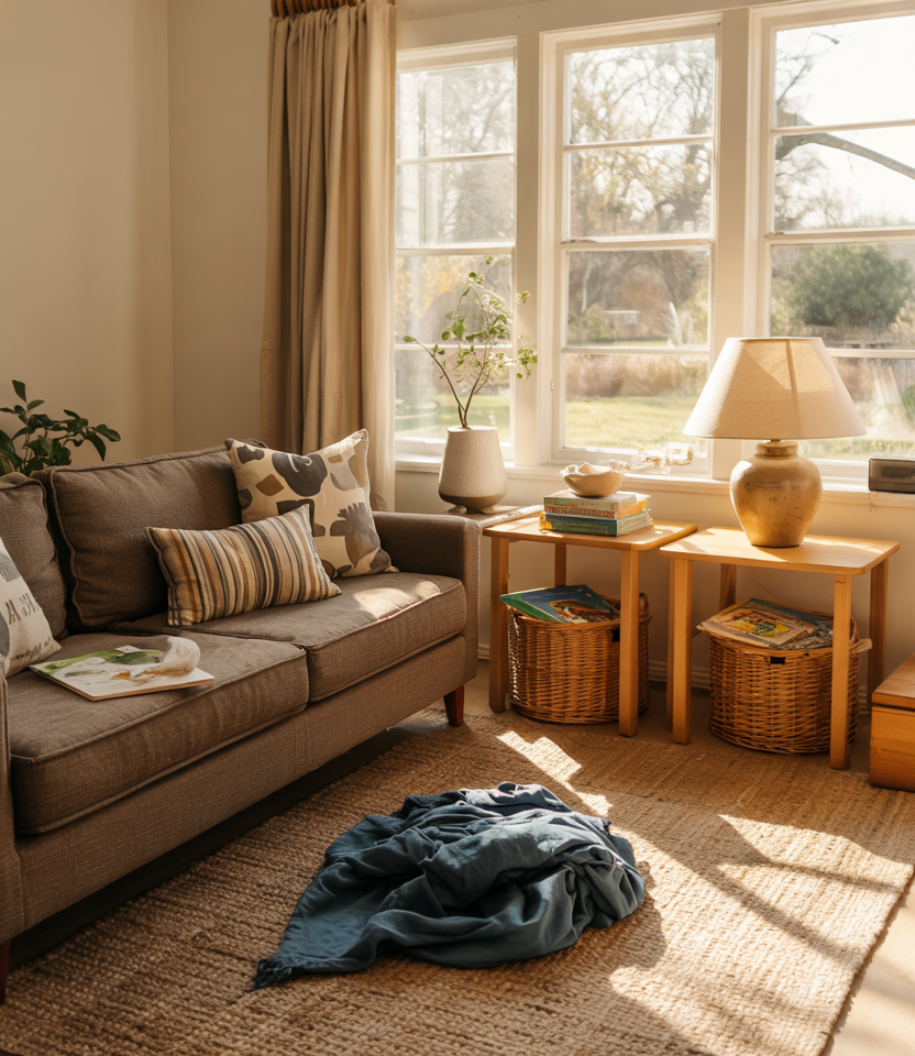 A medium-brown sofa strikes a balance between durability and design. Shades in the medium range hide everyday wear while still looking polished. Paired with kid-proof rugs and wipe-friendly surfaces, the room remains stylish without being fragile.