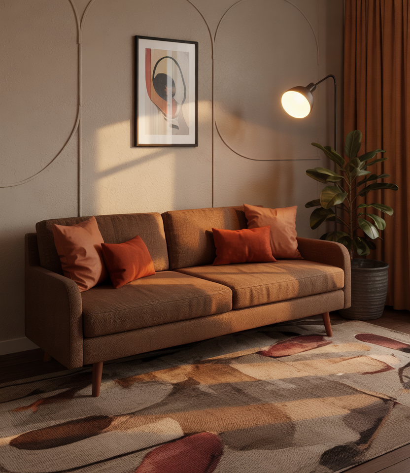 A brown sofa becomes surprisingly playful when paired with color. Think saturated pillows, patterned rugs, and art that leans colorful or warm orange for contrast. This approach turns the couch into a grounding force, letting vibrant accents feel deliberate rather than chaotic.