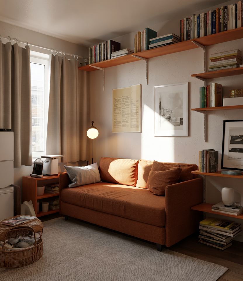 A brown couch can double as a cozy reading anchor in smaller homes. By layering soft throws and items in muted cozy hues or gentle, apartment-friendly décor, you make a warm space feel personal and intimate. A nearby floor lamp and shelves beautifully complete the nook.