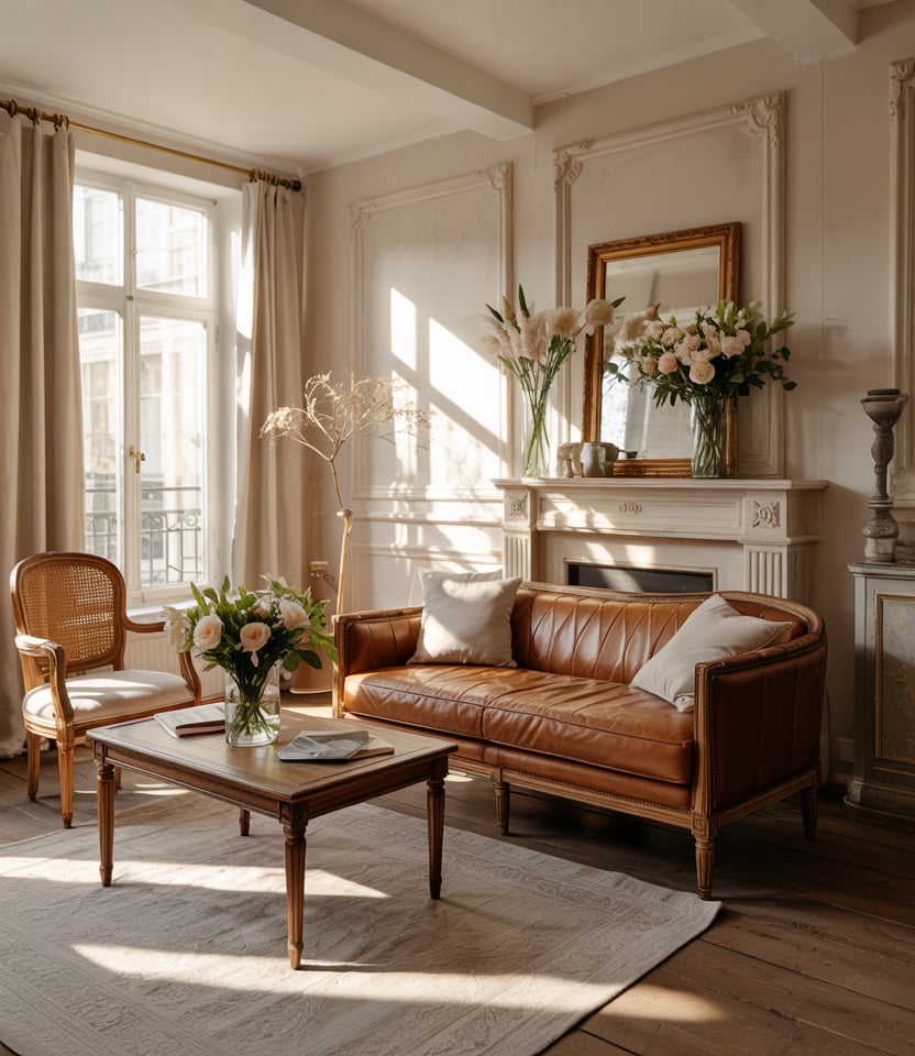Brown sofas also shine in softer, romantic styles. A gently aged leather couch complements French country leather charm, enhanced with linen drapes, carved wood, and delicate florals. Add touches of warm decor to keep the room balanced, not overly ornate.