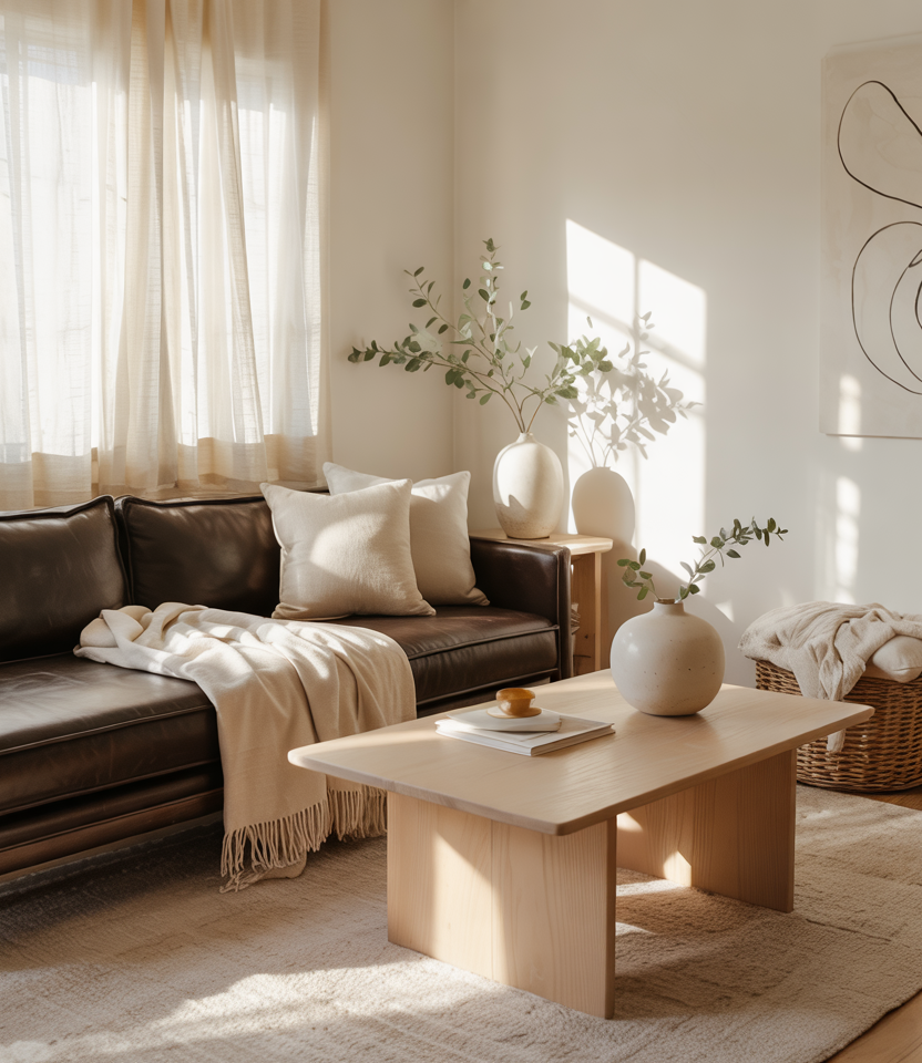 A soft modern living room lets a brown sofa feel intentional rather than heavy. Pairing it with creamy walls and airy textiles brings balance, especially when the piece leans slightly beige or warm tan. This look works beautifully in homes that want calm energy without feeling overly minimal.