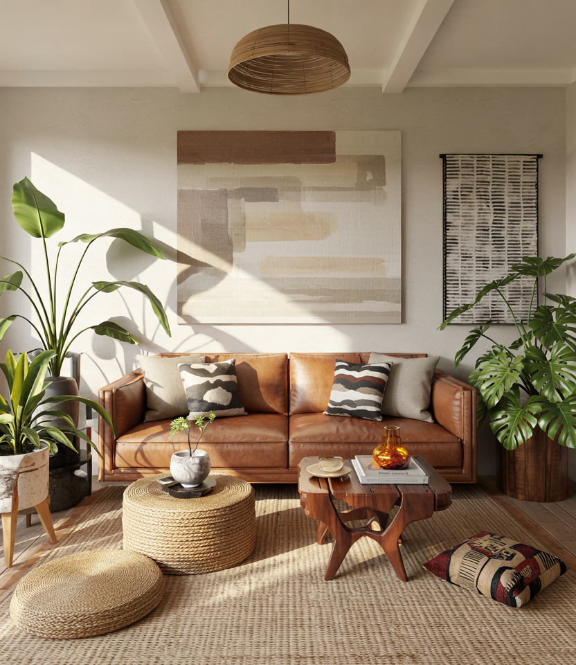 For a relaxed vibe, a brown sofa fits beautifully into a boho aesthetic. Think global textiles, oversized plants, and natural materials. A bohemian leather finish or warm red and rust accents bring a collected, worldly feel that never looks too staged.