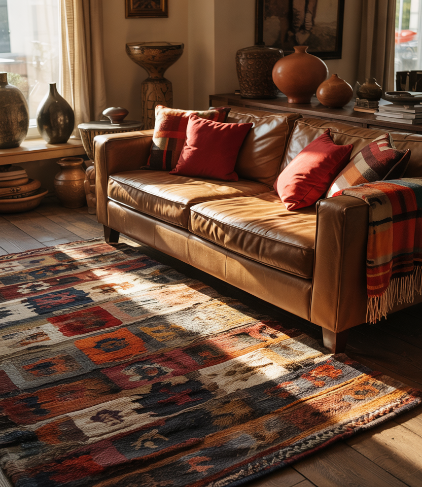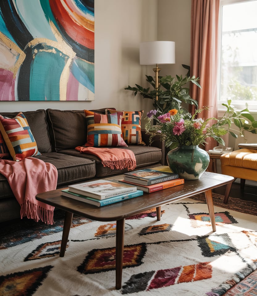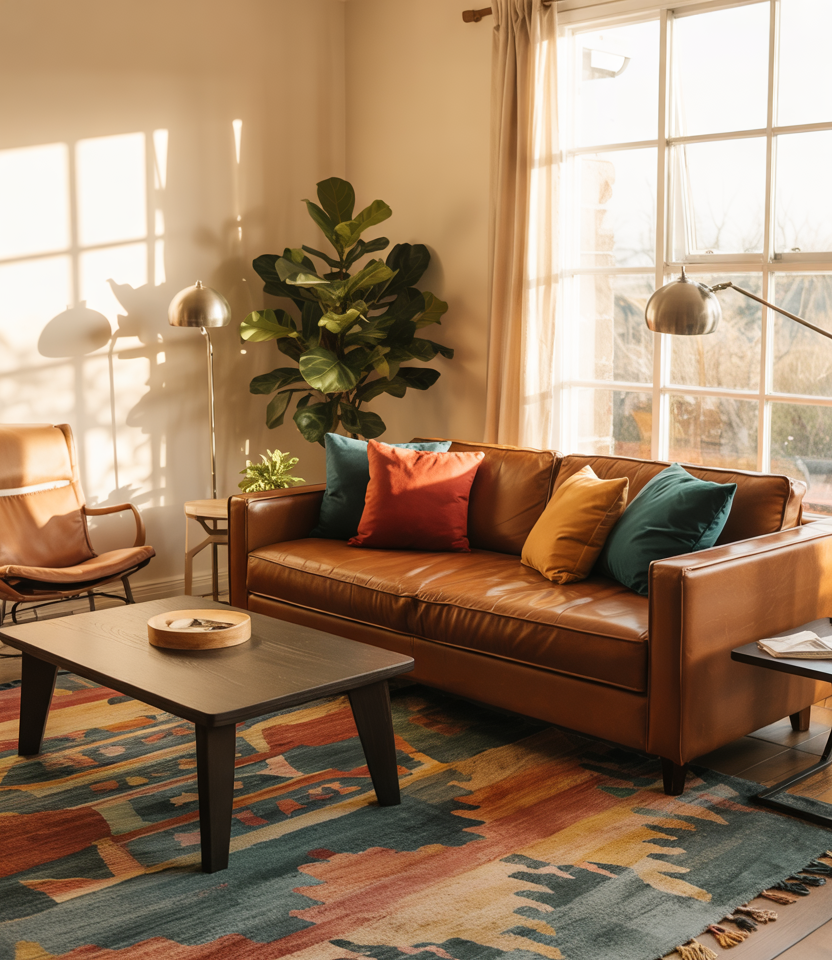 A brown sofa becomes surprisingly playful when paired with color. Think saturated pillows, patterned rugs, and art that leans colorful or warm orange for contrast. This approach turns the couch into a grounding force, letting vibrant accents feel deliberate rather than chaotic.