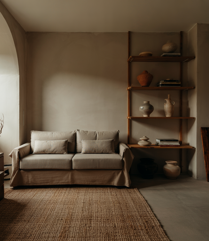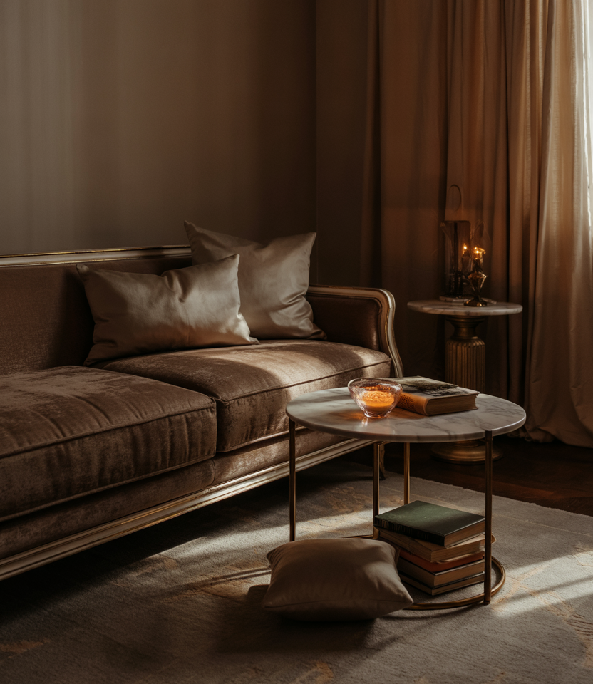 For a touch of glamour, a brown sofa dressed in velvet brings richness and drama. The fabric’s sheen pairs beautifully with brass accents and moody lighting, creating a layered look that feels both modern and indulgent. It’s an elevated take on everyday essentials.
