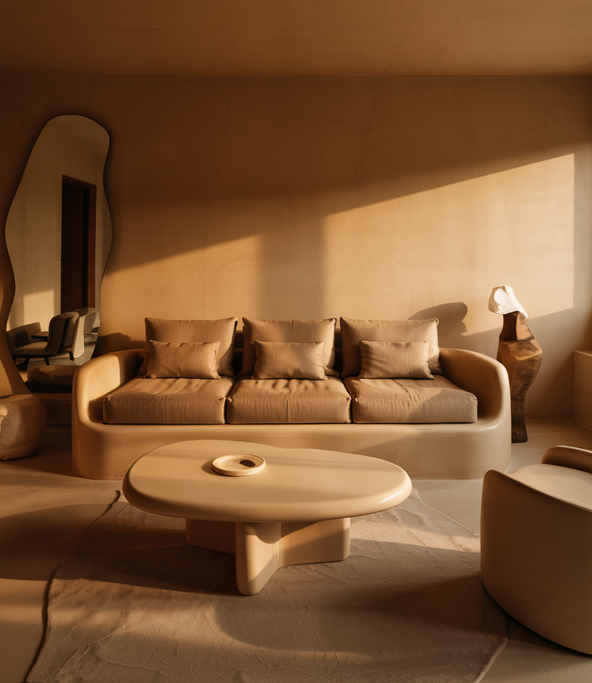 A tan-toned brown sofa blends seamlessly with curvy furniture and sculptural pieces. Incorporating soft forms—like round poufs or wavy mirrors—enhances the calming effect of tan and airy light elements. The result is a welcoming space with gentle movement.