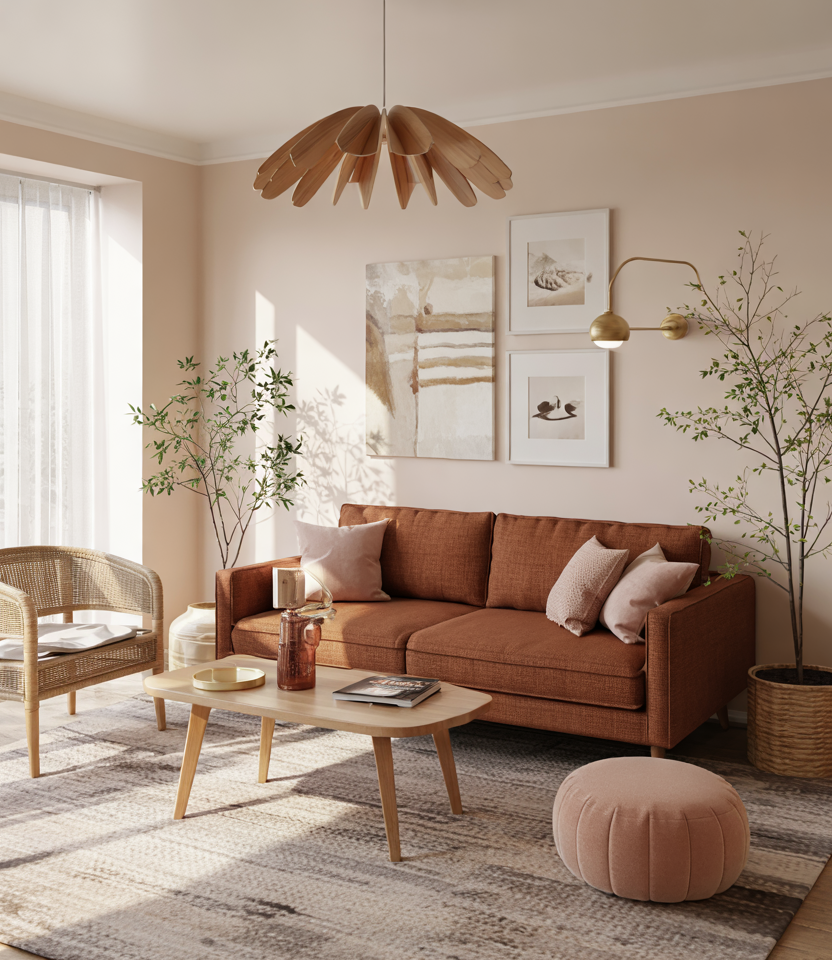 Brown sofas can also play into softer, feminine aesthetics. Blending blush hues, curved silhouettes, and warm textures gives the space a youthful glow. Pairing these details with subtle girly accents or muted beige pieces keeps the palette sophisticated rather than overly sweet.