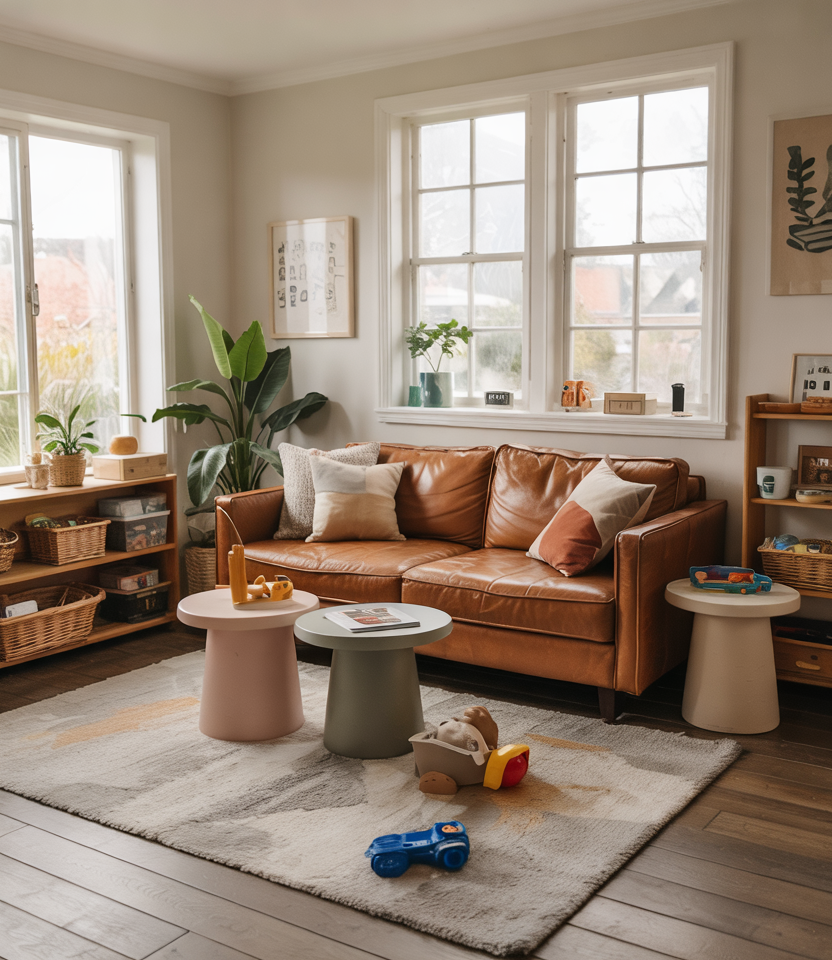 A medium-brown sofa strikes a balance between durability and design. Shades in the medium range hide everyday wear while still looking polished. Paired with kid-proof rugs and wipe-friendly surfaces, the room remains stylish without being fragile.