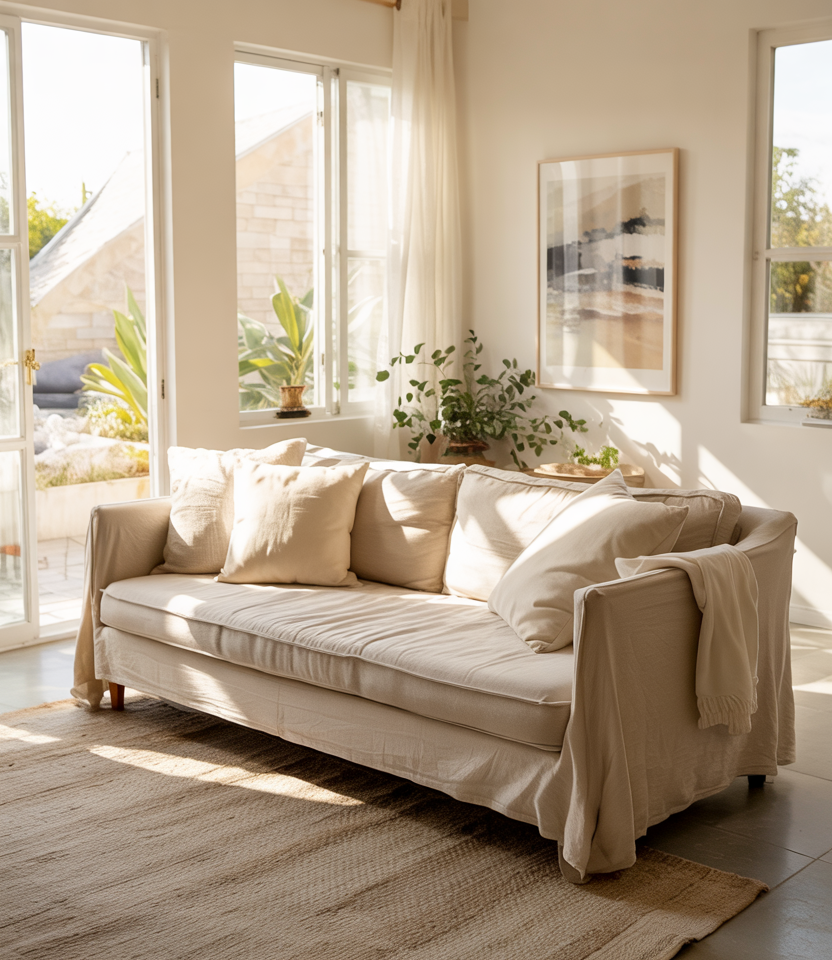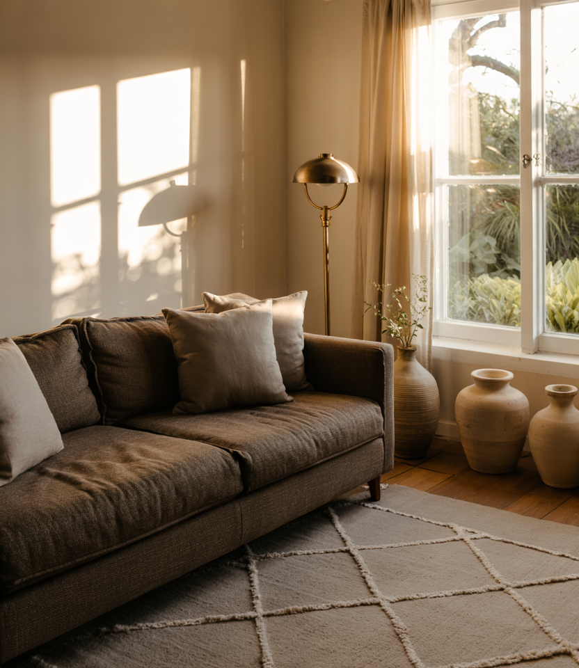 A lighter brown couch—think muted sand or soft latte—blends beautifully with breezy interiors. Accents in light tones or soft grey give the whole space a sun-washed elegance. This idea suits anyone craving calm, airy living without veering into stark minimalism.