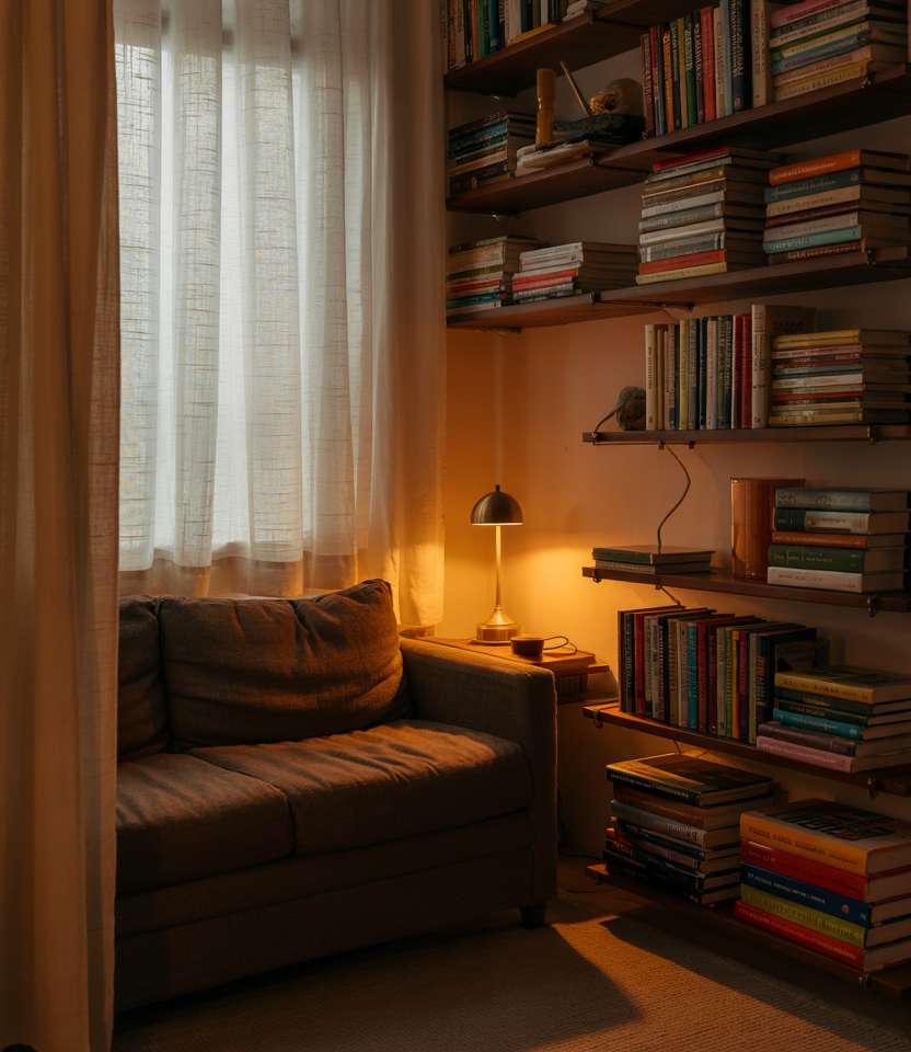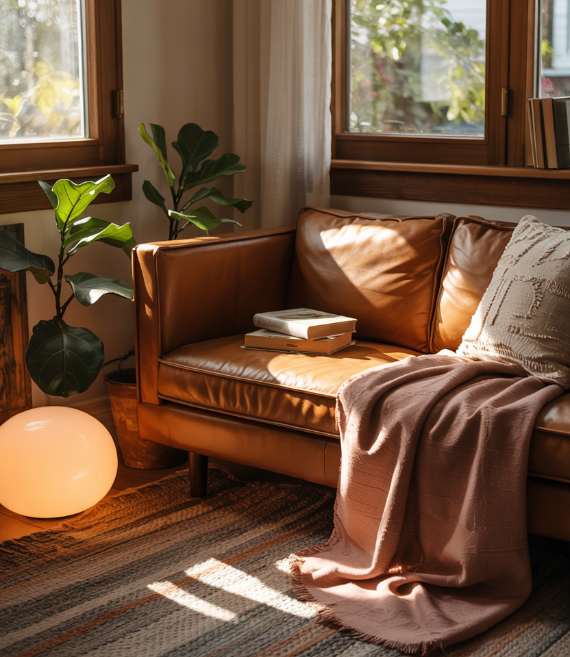 A brown couch can double as a cozy reading anchor in smaller homes. By layering soft throws and items in muted cozy hues or gentle, apartment-friendly décor, you make a warm space feel personal and intimate. A nearby floor lamp and shelves beautifully complete the nook.