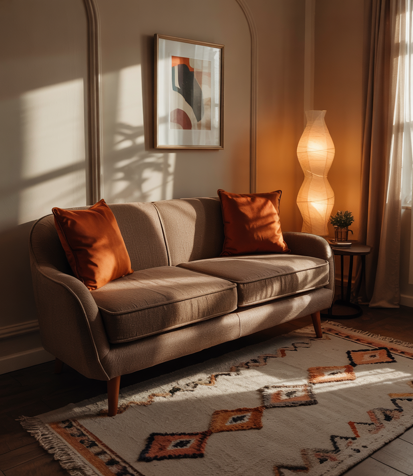 A brown sofa can tap into retro style when paired with warm accents. Introducing playful touches like burnt orange, rounded wood pieces, or vintage patterns creates nostalgic charm. The palette feels upbeat and approachable without leaning fully into mid-century aesthetics.