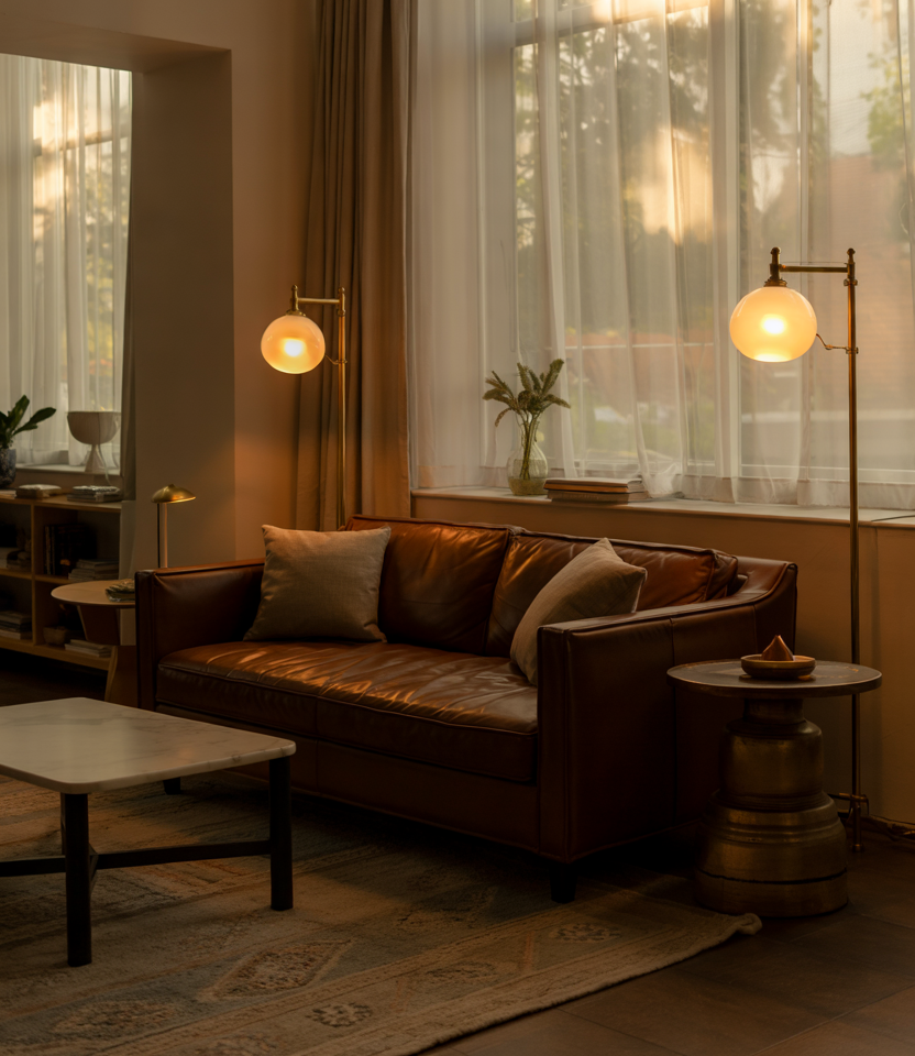 A deep brown sofa in rich leather transforms a living room into a refined lounge. Coupled with soft light, layered neutrals, and warmth in textures, it perfectly balances the boldness of darker tones. It is ideal for homes seeking a no-nonsense, quietly sumptuous atmosphere.