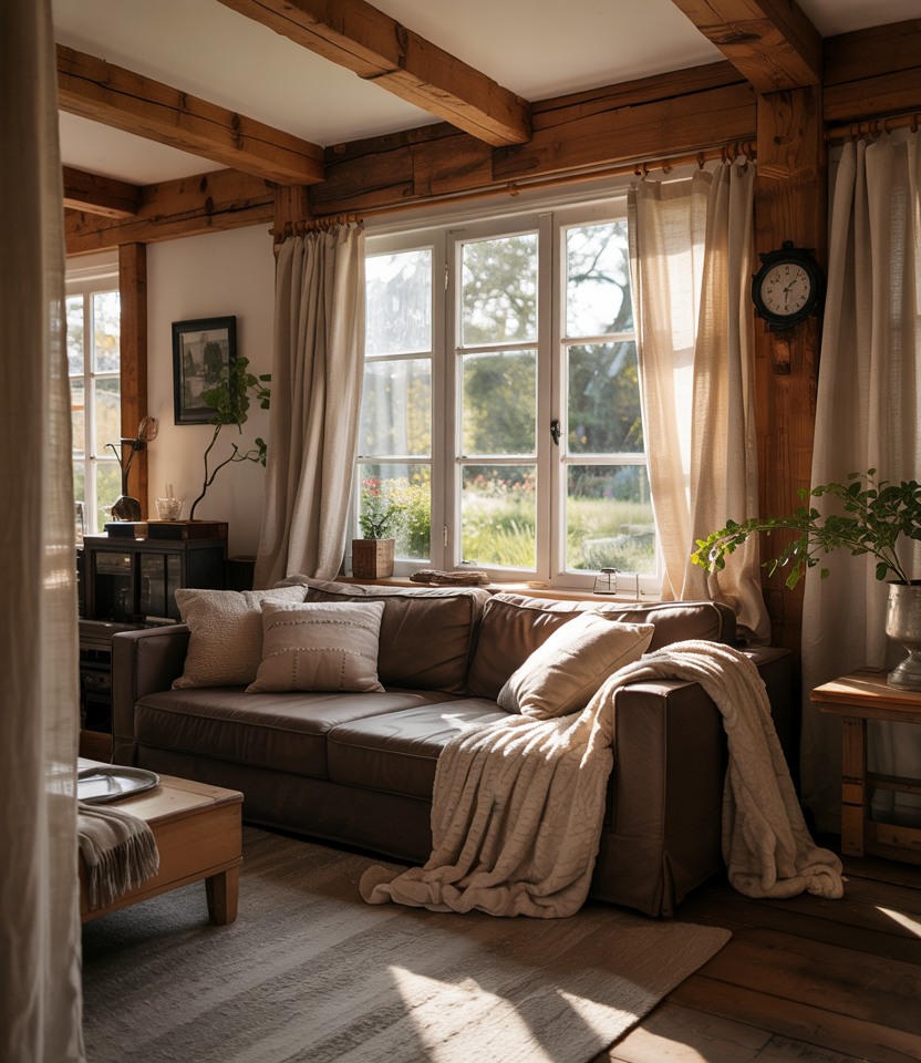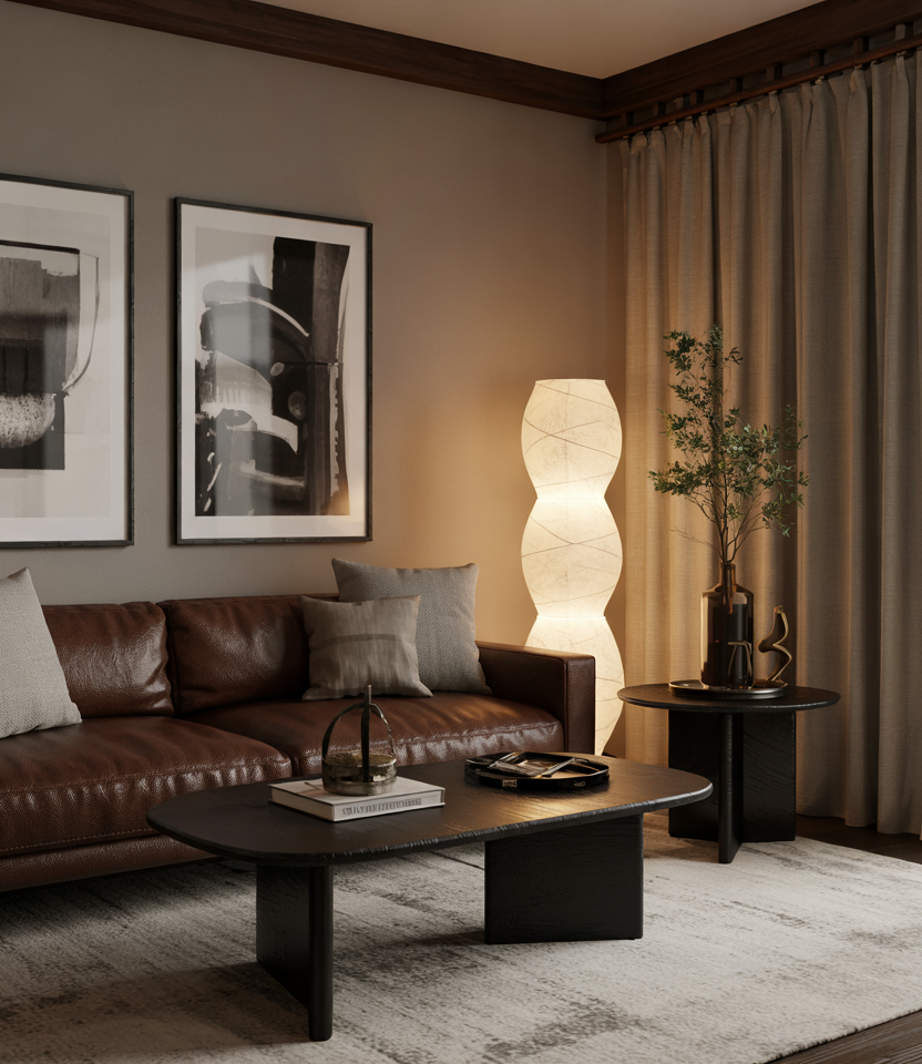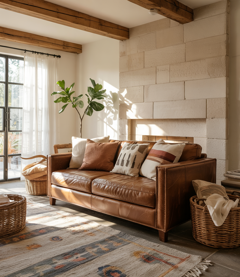For those drawn to earthy design, a brown leather sofa sets the stage. Pairing it with weathered wood, woven baskets, and rugged textures fits naturally with rustic homes or weekend cabins. A space grounded in warm browns instantly feels connected to nature.
