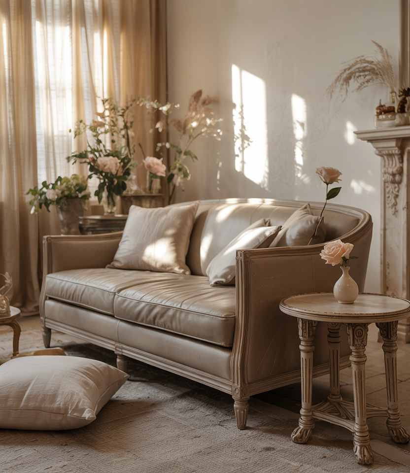 Brown sofas also shine in softer, romantic styles. A gently aged leather couch complements French country leather charm, enhanced with linen drapes, carved wood, and delicate florals. Add touches of warm decor to keep the room balanced, not overly ornate.