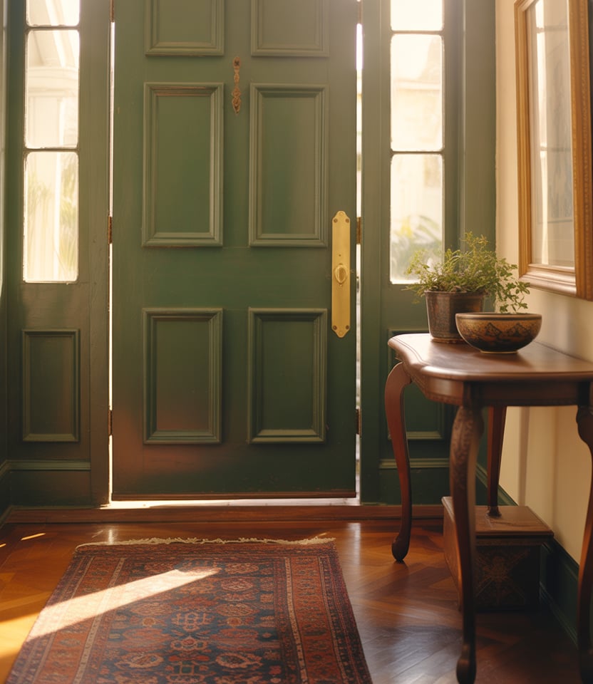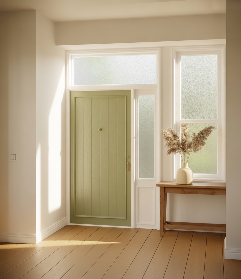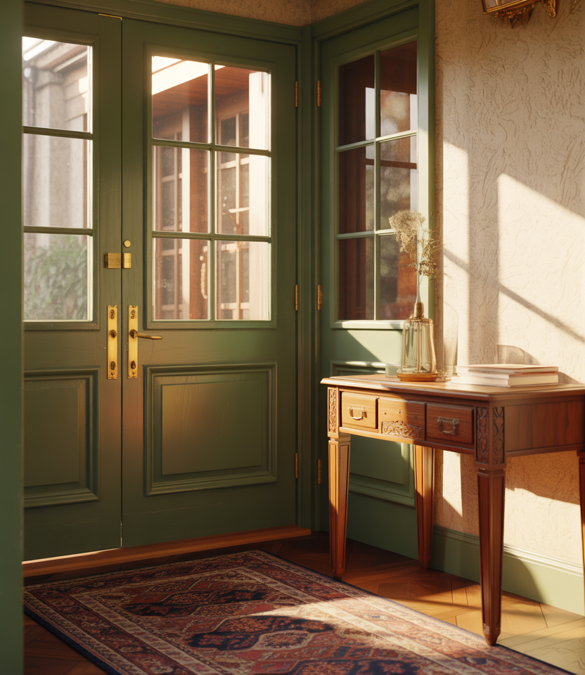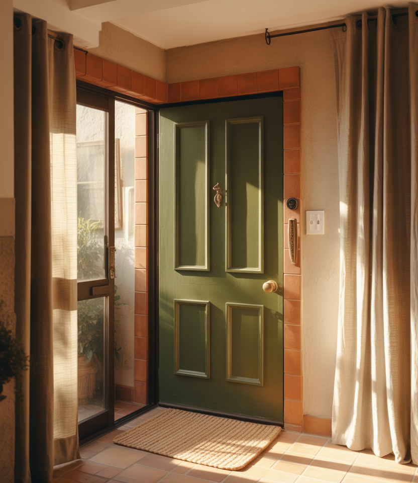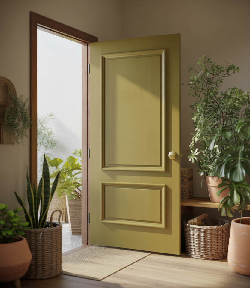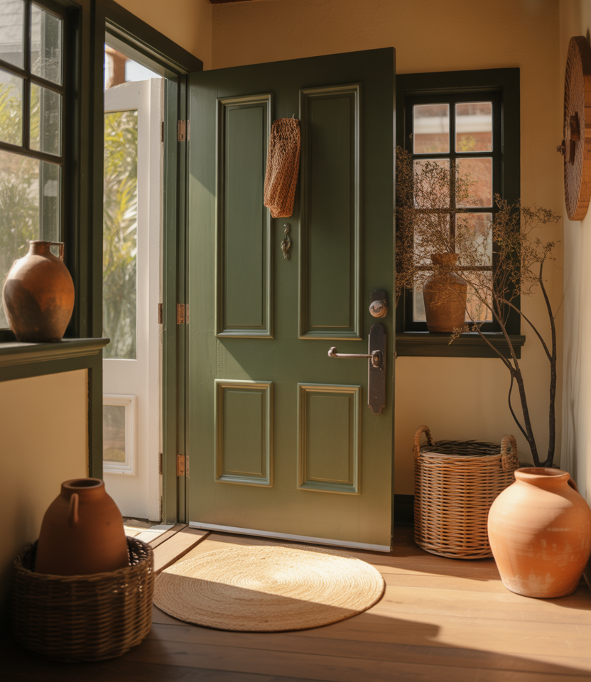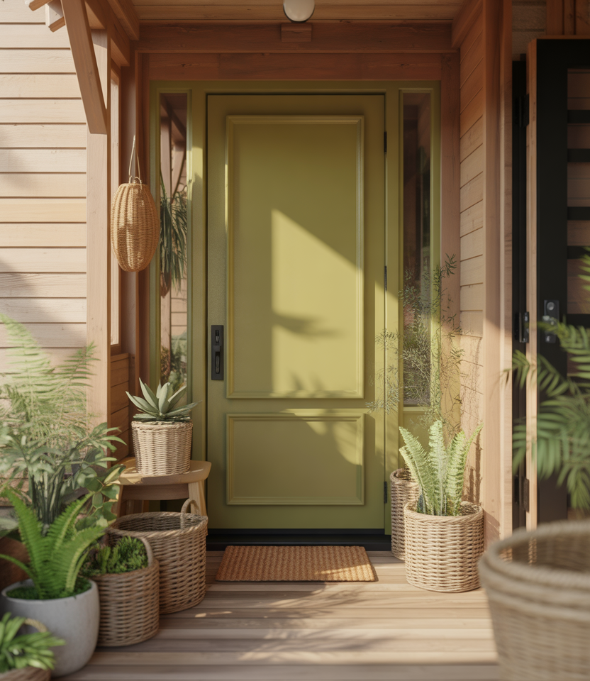 Olive tones sit beautifully between green and neutral, making them a versatile front door color for 2026. They complement a beige house, stone exteriors, and landscaping-heavy yards. This shade feels organic and settled, as if it’s always belonged there.