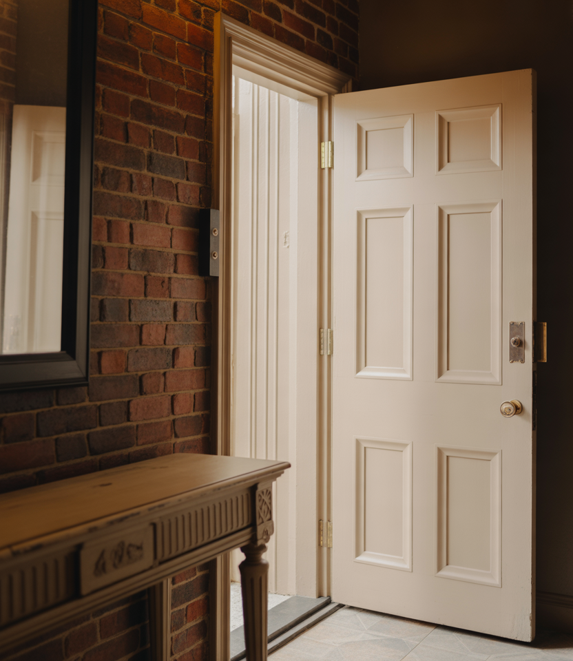 A creamy, off-white door feels especially right on a red brick or red brick house, offering contrast without sharpness. As a front door color for 2026, it bridges traditional and modern effortlessly. The warmth in the color keeps the entry from feeling stark while still looking clean and intentional.